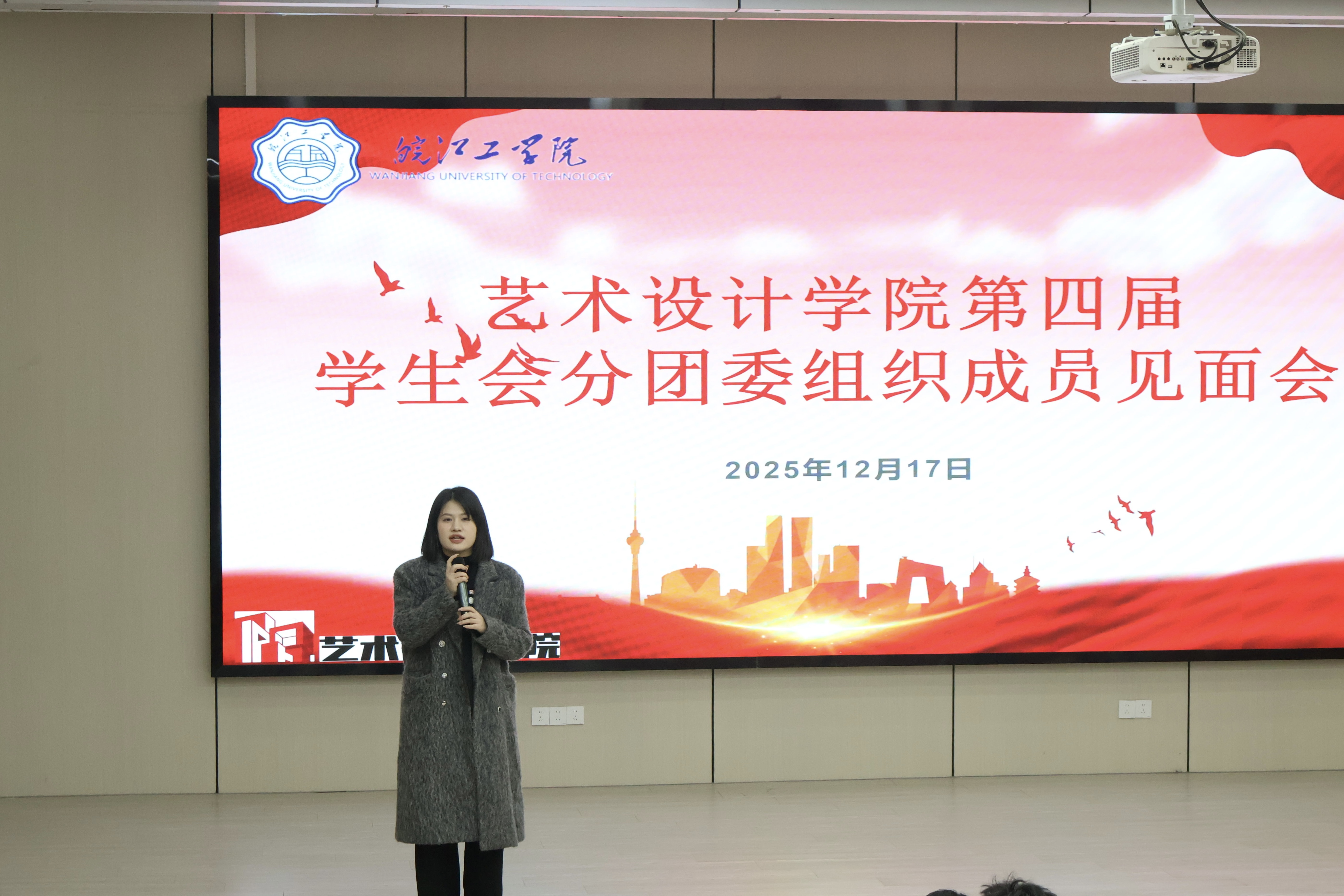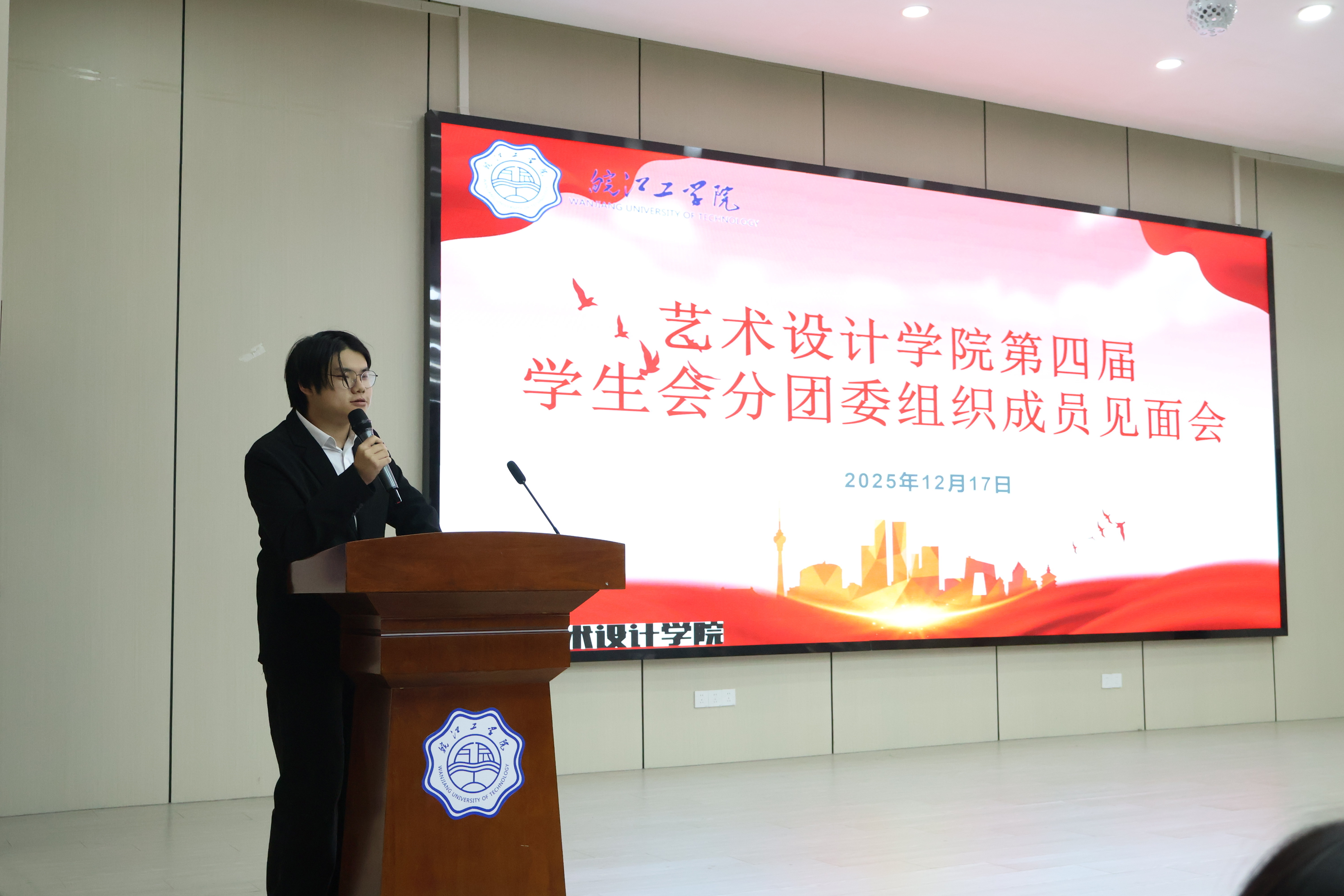 会议伊始,学院学生会主席团成员王浩然作年度工作汇报。他以“以评促建、服务育人、共创佳绩”为主线,从夯实组织基础、打造品牌活动、强化跨校区协同三个方面系统梳理了过去一年的工作成果,重点介绍了围绕学校合格评估开展的系列动员与服务保障工作,以及“天青杯”辩论赛、“大艺术家”等各项深受学院师生好评的品牌活动。随后,学院分团委学生副书记张謦令进行工作回顾。她总结了过去一年开展的主题团日与思想引领活动,并动员全体学生干部,应立足艺术设计专业特色,将理论学习的深度与创新实践的活力相结合,切实发挥好连接学院与广大同学的桥梁纽带作用。