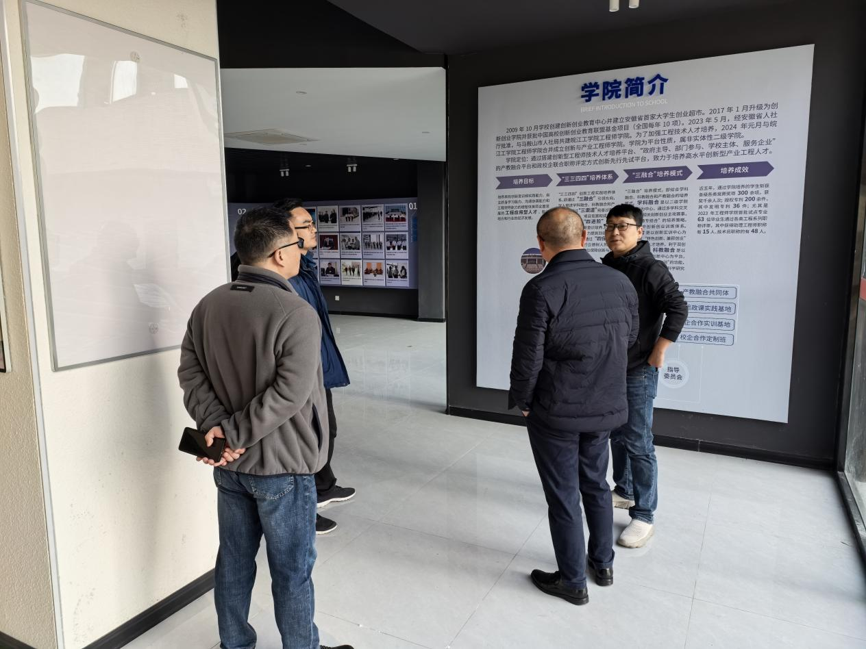 黄昭明副院长首先向黄继刚副院长一行详细介绍了beat365正版唯一入口必一工程师学院的发展历程。他提到,学院自创立以来始终以“服务地方产业、培养实战型工程师”为宗旨,通过整合政府、高校和企业资源,逐步构建了覆盖“校企协同育人、项目驱动创新”的教育体系。黄昭明强调,学院近年来通过优化专业布局、强化实践平台建设,在应用型工程师培养上已取得一定成效。在谈及地方支持时,黄昭明教授重点介绍了马鞍山市政府对本市三所本科院校工程师学院的扶持政策。他提到,政府通过“政策引导、资金配套、项目落地”三位一体举措,为学院打造了产教融合生态圈。推动本地企业与工程师学院共建实验室、冠名班和实习基地,实现教育链与产业链的深度衔接。