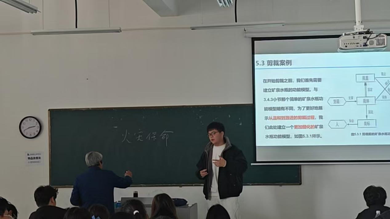 在讨论逐步深入后,朱昌平教授进一步引入“功能替代”和“剪裁规则”两种创新方法,帮助学生在既定框架内展开思考:先梳理逃生场景中的关键功能与核心需求,再对现有方案的关键环节进行取舍与重构。在方法讲解与示范过程中,朱教授强调“创新不是凭空想象”,而是要在清晰的需求分析、可验证的逻辑链条和可落实的实施路径上展开。这一环节为后续分组研讨提供了共同的分析语言,也提升了学生表达与论证的规范性。