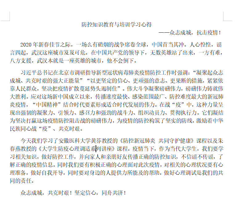双创学院充分认识“安徽省高校疫情防控培训”系列课程重要性,在此次学习中,双创学院全体师生对疫情防范意识和疫情防控措施有了更加深刻的了解,这也有利于开学后制定和落实双创学院对疫情防控的措施和方案。全体师生在课程中学到的疫情防控知识和心理健康教育理论可以运用到实际生活中,能够促进自身的健康发展。这对学院的教学发展起到了良好的导向作用,促进了教学优势转化为支持防疫斗争的强大力量。