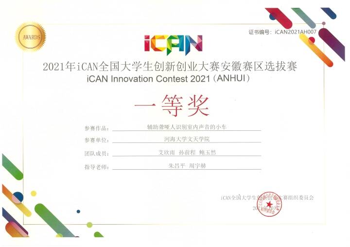 下面,我们来看看此次iCAN大赛一等奖的奖状吧!