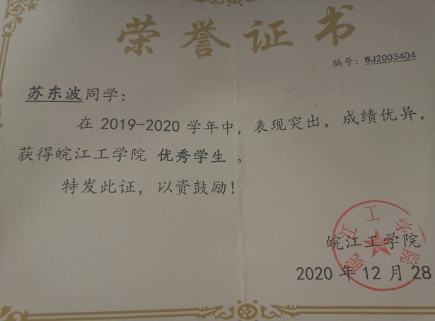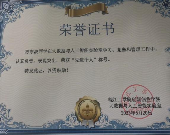 台,让我能够与实验室其他优秀的同学认识,互帮互助,共同进步。在校期间我获得过两次“二等奖学金”,一次“优秀学生”称号,通过了计算机二级,英语四级,这要得益于实验室提供的良好的学习平台。最后,感谢各位老师对我的帮助和教导,在这里祝愿母校越来越好。