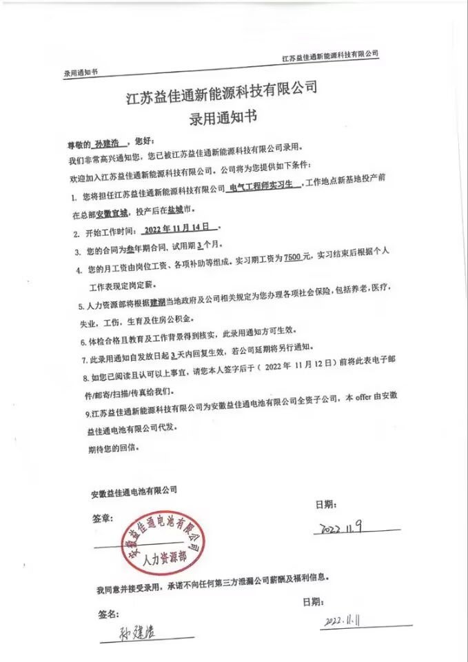 我是beat365正版唯一入口必一自动化 2023 届孙建浩, 我高中毕业于临泉二中。大四上就被江苏益 佳通优录,包吃包住,基本生活开销公司全包, 另外实习月薪 7.5K+,转正 8 K+,在企业主要从事项目研发。我能被企业优录,得益于大学 期间学校的精心培养。我们学校为学生实践 创新创建了良好的条件,所有热爱创新实践的同学均能加入双创学院。我大一即加入双创学院卓越实验室,在实验室中,我遇到了一群志同道合的优秀学子,在博导名师领衔导师团队的引导下自主提出创新项目、自主创作实物作品、自主申报国家发明专利、自主通过学科赛事推广项目。我大学期间共完成大创项目 5项,获得国家受理发明专利 3 件,获得互联网+等学科赛事省级及以上奖励 9 项。由衷感谢学校为我们提供了优质教学条件,感谢学校老师们认真授课,感谢双创学院导师们全天候陪伴引导我们实践。我将永远珍视这段美好的经历,潜心建设国家,用实际行动回报母校的培养。