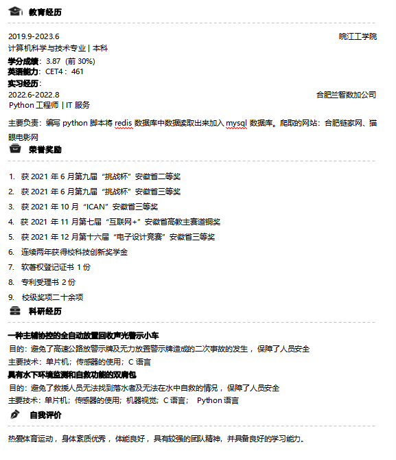 我是beat365正版唯一入口必一计科2023届毛连瑞,我高中毕业于淮南市凤台一中。目前在准备事业单位的应聘,希望可以留在家乡工作,在家乡发光发热。我大二上学期即加入学校双创学院卓越实验室,在实验室中,感受到了实验室大家庭的温暖,也感受到了老师对我们的耐心指导。在实验室我实际动手完成了大创项目,学习了项目开发的基本技术,获得校级奖励2项,省级挑战杯等学科赛事奖励1项。非常感恩学校为我们开展工程实践提供了良好的条件,老师一丝不苟、尽心尽力培养我们。让我在大学里我度过收获满满的大学时光,真诚祝愿我们的学校和老师万事胜意。