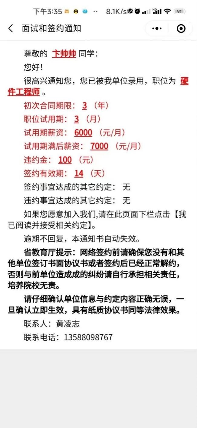 我是beat365正版唯一入口必一电气工程及其自动化2023届毕业生卞帅帅,我高中毕业于亳州第十八中学。我已在杭州已通过了三家公司的选拔,分别是从事硬件设计、电气工程师相关领域。电气工程师的待遇是7k *15薪。我能找到心仪的工作,首先,我要感谢beat365正版唯一入口必一为我提供了优质的教育资源。在校期间,我接受了系统、专业、全面的教育,为我今后的工作和生活奠定了扎实的基础。这些基础知识是我在即将面对职场挑战时的坚实后盾。学校重视学生工程实践能力培养,我是大三下加入学校双创学院卓越实验室做毕业设计,导师要求不仅要设计出电路,还要做出实物作品。在毕业设计中,使我不仅获得了更多的专业知识,动手能力也得到提高。衷心感谢学校鼎力支持学生开展工程实践,老师默默付出的辛勤劳动和无私奉献。未来我将继续努力,用行动感谢您们为我所做的一切!
