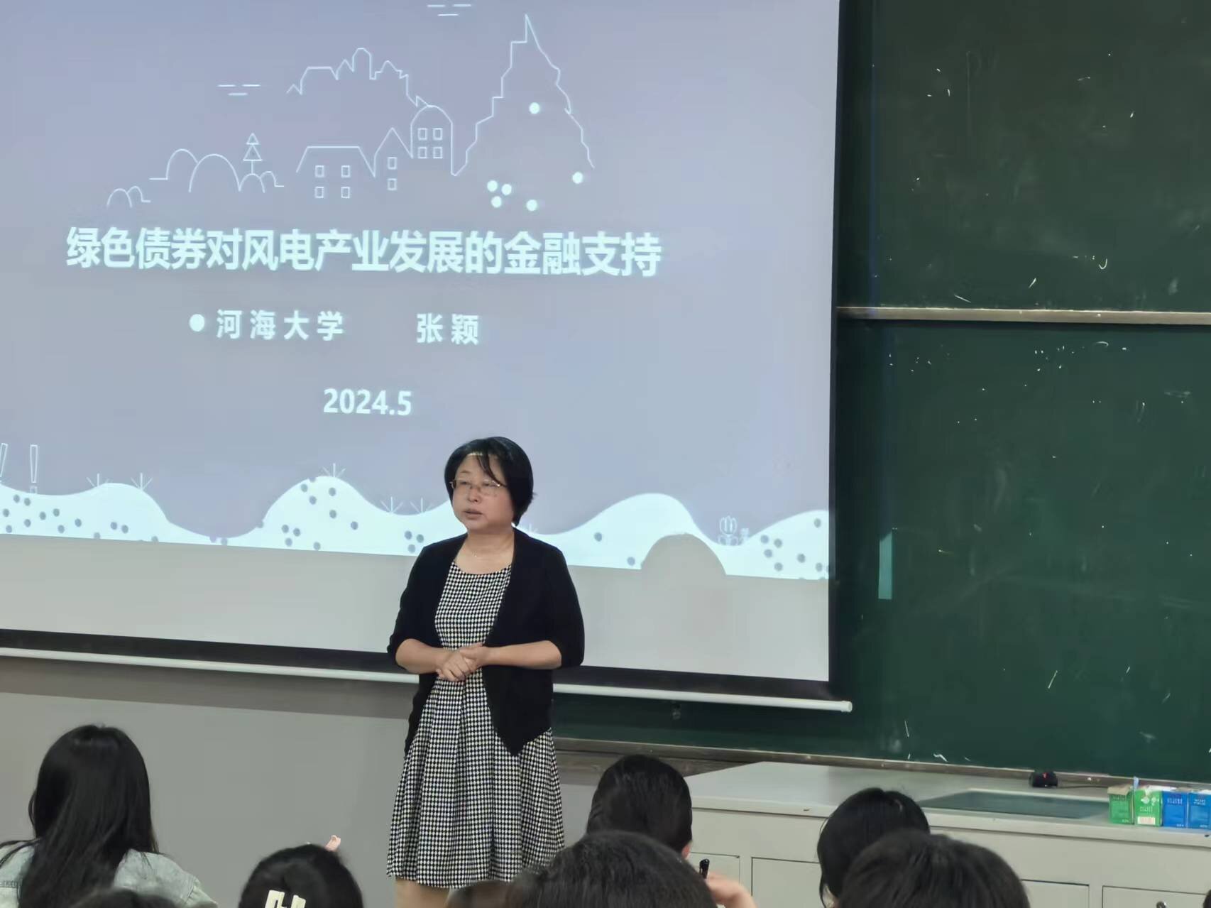 为了促进教育资源共享,加深同学们对本专业课程设计的理解以及丰富同学们在课余时间对金融市场的认知,2024年5月8日下午,财经学院邀请到河海大学商学院张颖教授为21财管学生带来一场以“绿色债券对风电产业发展的金融支持”为题的讲座。