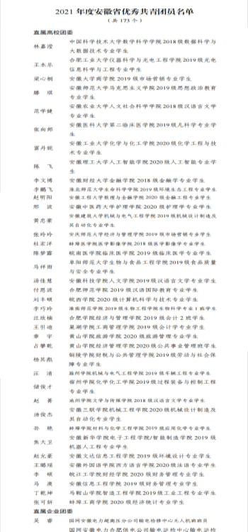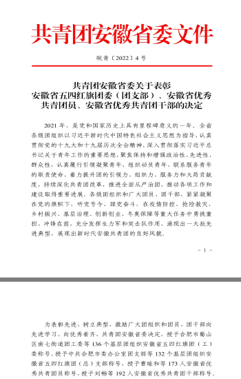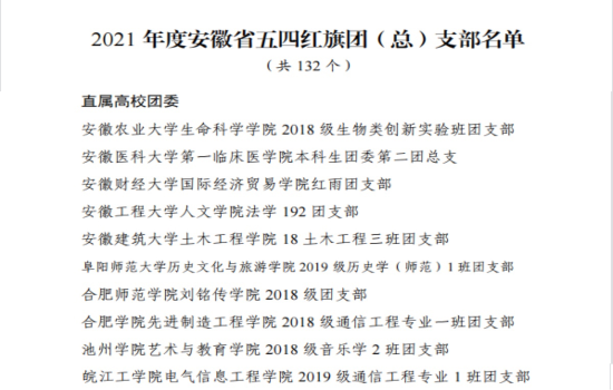 为表彰先进、树立典型,激励广大团组织和团员、团干部向先进学习、向优秀看齐,近期,共青团安徽省委表彰了2021年度安徽省五四红旗团委(团支部)、安徽省优秀共青团、安徽省优秀共青团干部,beat365官网电气信息工程学院2019级通信工程专业1班团支部获评“安徽省五四红旗团支部”称号、财经学院2020级财务管理专业学生李硕获评“安徽省优秀共青团员”称号。