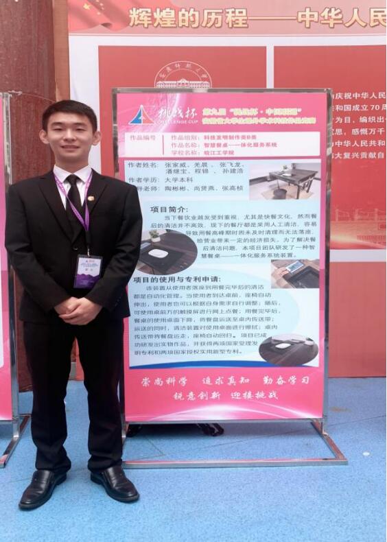 张家威,男,电气信息工程学院2019级自动化专业,获评自主创业类“安徽省百优大学生”荣誉称号。张家威于2021年创办马鞍山市威晨科技有限公司,建立以全自动智能餐桌为核心,单目激光测距三维重建系统为辅助,推进智能化餐厅项目落实的创业计划。在校期间主导完成“智能药盒”、“智慧餐厅——行业领先的无人餐厅一体化服务系统”、“基于单目激光测距的三维重建系统”三项国家级大学生创新创业项目,获得3项国家发明专利授权、3项国家实用型专利受理,获得第九届“挑战杯”安徽省大学生课外学术竞赛一等奖,2021年安徽省高校物联网应用创新大赛一等奖等省级奖项二十余项。