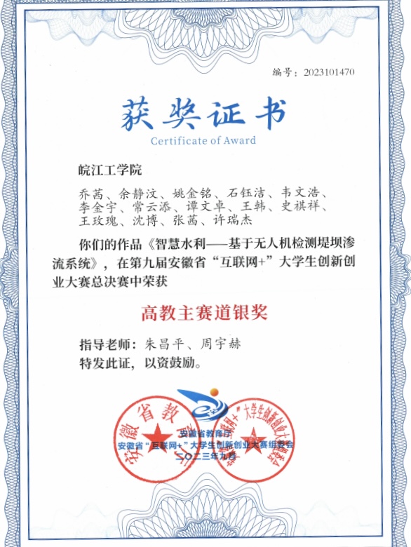 | beat365正版唯一入口必一 | 智慧水利一基千无人机检测堤坝渗流系统 | 乔茜 | 朱昌平、周宇赫 | 二等奖 |