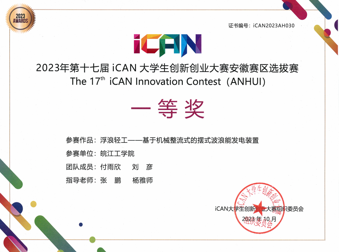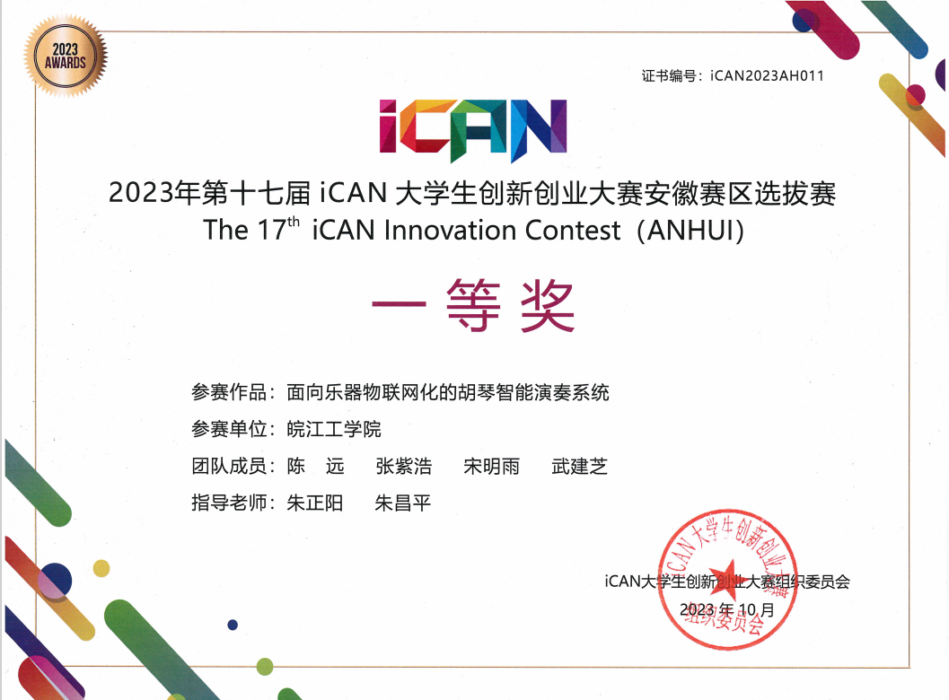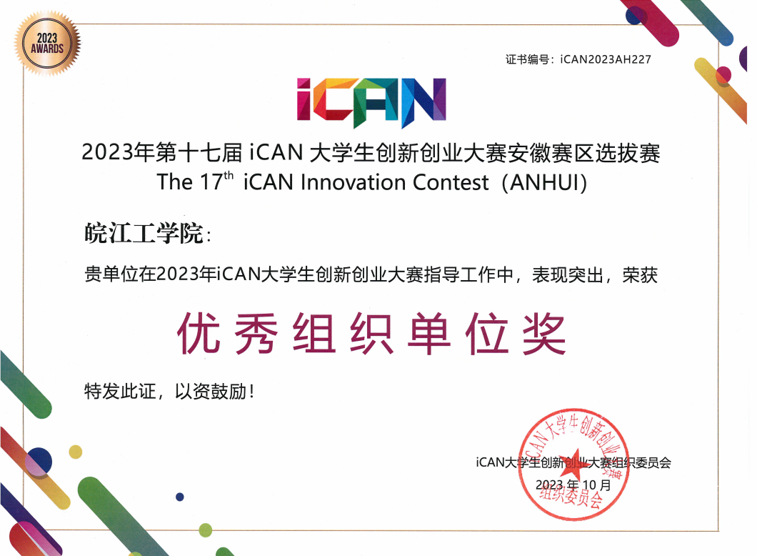 2023年3月22日,中国高等教育学会公布了教育部认可度最高的84项高校学科赛事,iCAN大学生创新创业大赛排序54,beat365官网一直积极参加iCAN国际创新创业教育联盟的各项活动。2023年有60支队伍、300多名同学报名参赛,经过学校选拔赛,有25支队伍、近150名同学入围第十七届iCAN大学生创新创业大赛安徽赛区选拔赛决赛,beat365官网在省决赛中荣获一等奖3项、二等奖8项、三等奖14项。3支队伍将于2023年12月赴北京奥林匹克塔参加全国总决赛,beat365官网陶彬彬、朱正阳、张鹏、杨雅师、朱昌平五位老师荣获优秀指导教师奖,beat365官网荣获优秀组织单位奖。