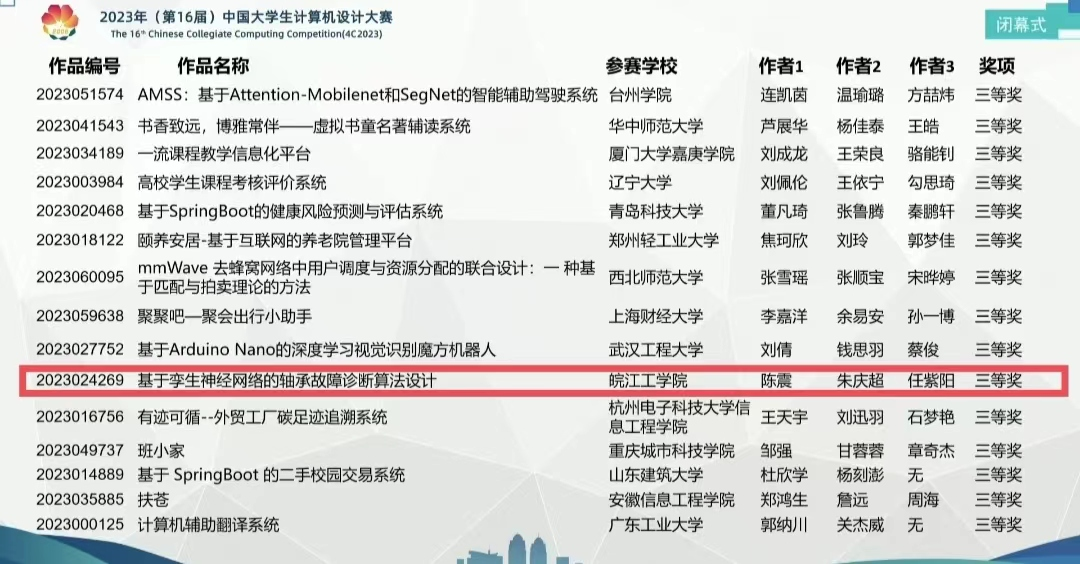 7月22日至26日,2023年(第16届)中国大学生计算机设计大赛全国总决赛在烟台成功举行。在电气信息工程学院王子、韩静老师的指导下,beat365官网计算机科学与技术专业的学生陈震、朱庆超、任紫阳的参赛作品喜获国家级三等奖。