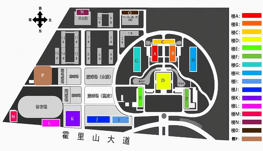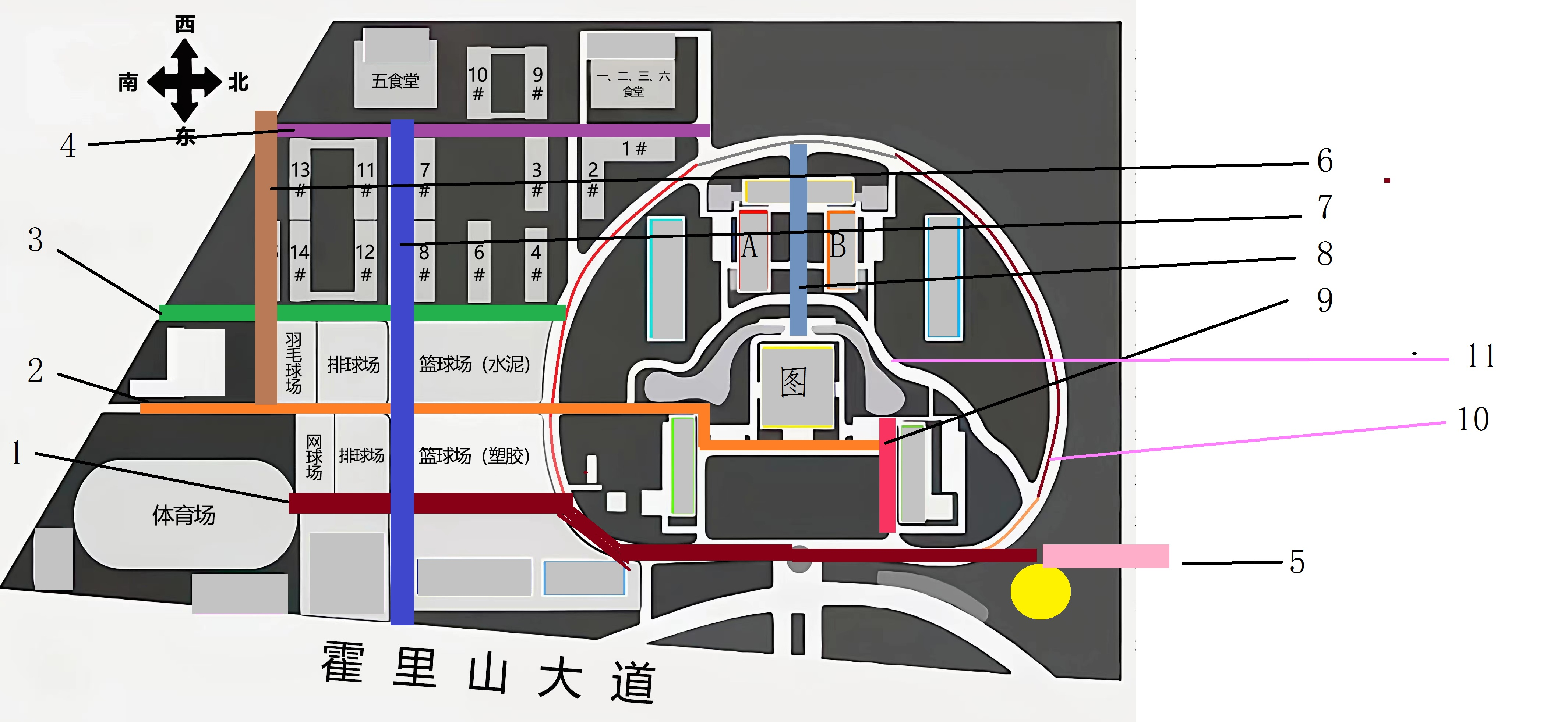 目前罗列学校道路有9个,环形道路2个,分别是: