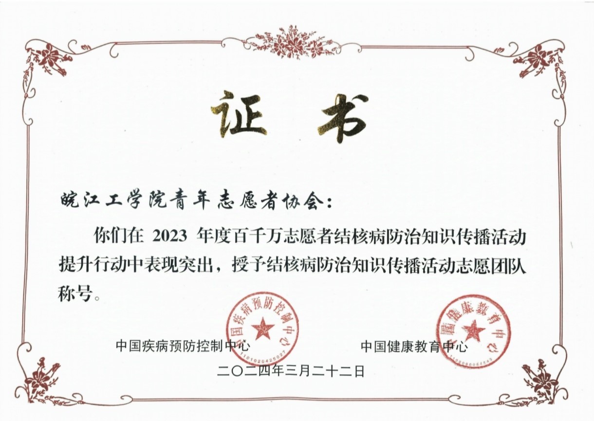 近日,中国疾病预防控制中心、中国健康教育中心公布2023年度全国“百千万志愿者结核病防治知识传播活动提升行动”推选结果,beat365官网青年志愿者协会被评为2023年度“百千万志愿者结核病防治知识传播活动提升行动”国家级优秀志愿者团队称号,并被安徽省结核病防治研究所、安徽省防痨协会评为2023年度“安徽省百千万志愿者结核病防治知识传播活动”省优秀志愿者团体称号。