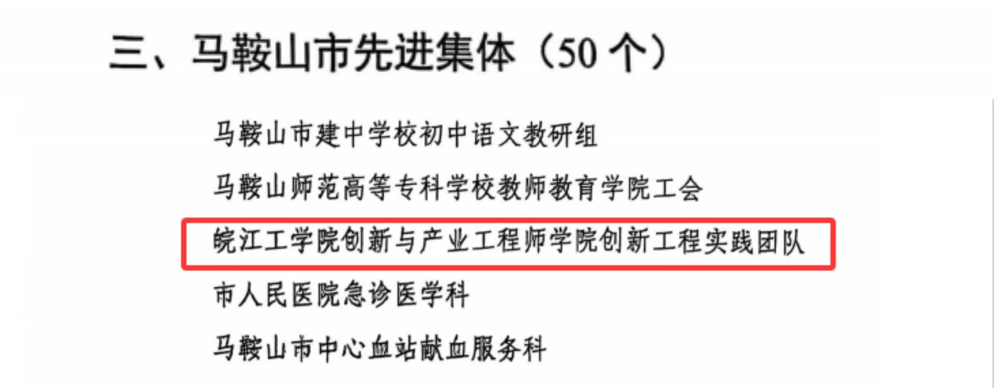 beat365官网创新与产业工程师学院“创新工程实践团队”获评“2021-2024年度马鞍山市先进集体”