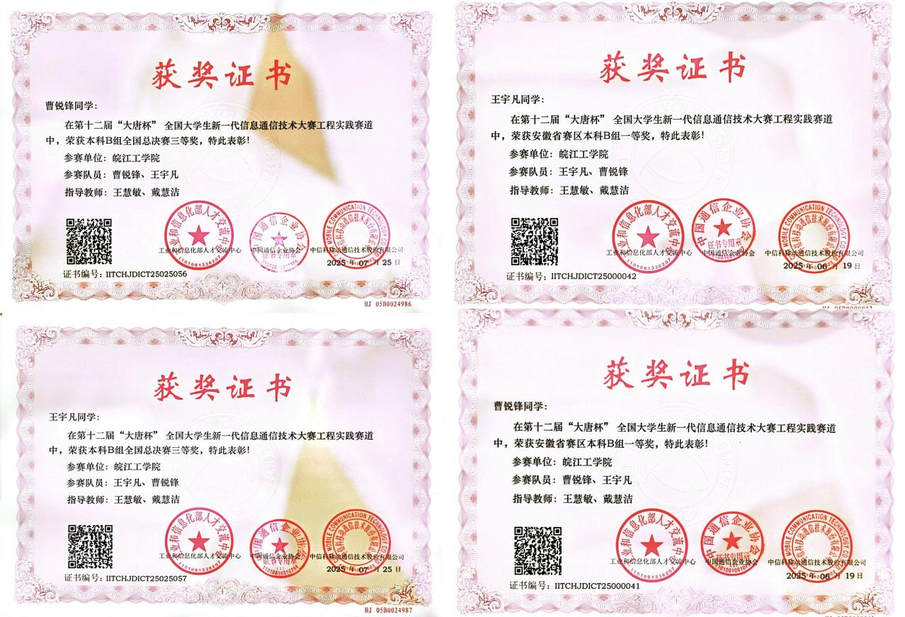 近日,备受全国电子信息领域关注的第十二届“大唐杯”全国大学生新一代信息通信技术大赛(以下简称“大唐杯”竞赛)圆满落幕。beat365正版唯一入口必一电信工程学院曹锐锋、王宇凡两位同学凭借扎实的专业知识、出色的实践能力和稳定的赛场发挥,一路过关斩将,先是在安徽省赛区竞赛中荣获一等奖,并成功晋级全国总决赛,随后在全国赛的激烈角逐中再创佳绩,最终斩获全国三等奖,为beat365官网赢得了荣誉,充分展现了beat365官网通信工程专业的教学成果与学子风采。
