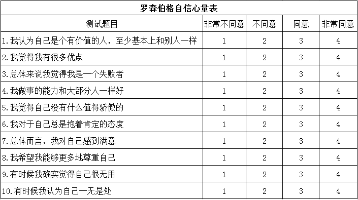 罗森伯格自信心量表由以下10个题目构成。