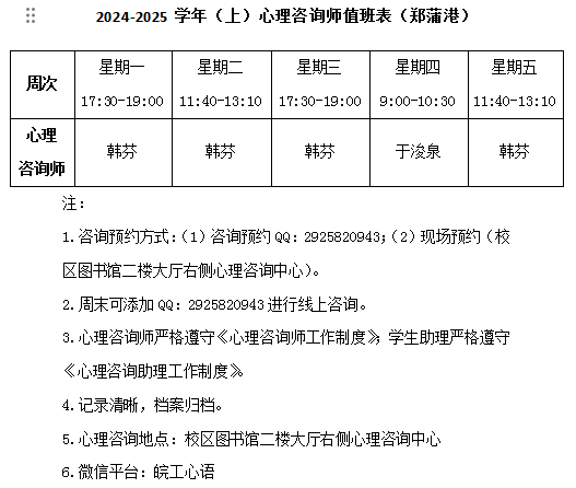3、现场预约:霍里山校区心理咨询地点:S楼1楼大学生心理咨询与健康研究中心;郑蒲港校区心理咨询地点:图书馆二楼大厅右侧心理咨询中心。