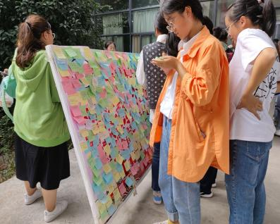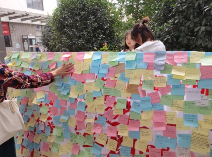 10月9日中午,以“倾听你的心声,诉说你的烦恼”为主题的“烦恼墙”活动在霍里山校区食堂门口开展,让同学们把平日里在学习和生活中的烦恼书写在便签并粘贴在“烦恼墙”上。