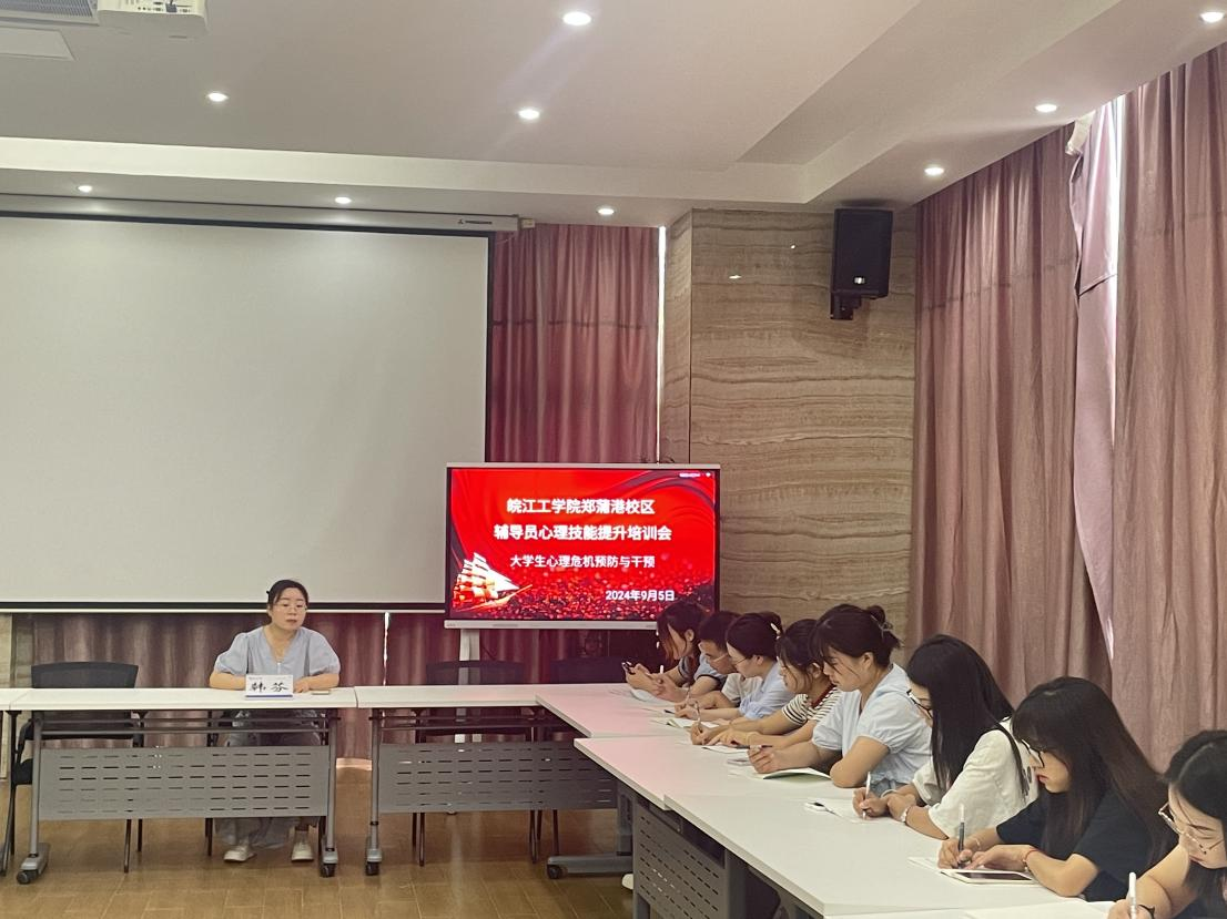 2024年9月5日下午14:00,郑蒲港校区心理中心在一号会议室举办了辅导员心理技能提升培训会,旨在提升校区辅导员对学生心理危机处理的能力,特别是掌握新生入学阶段可能出现的各类心理危机应对方法。此次培训的主题为“大学生心理危机预防与干预”,主讲人为心理咨询中心副主任韩芬,参会人员为校区全体辅导员。