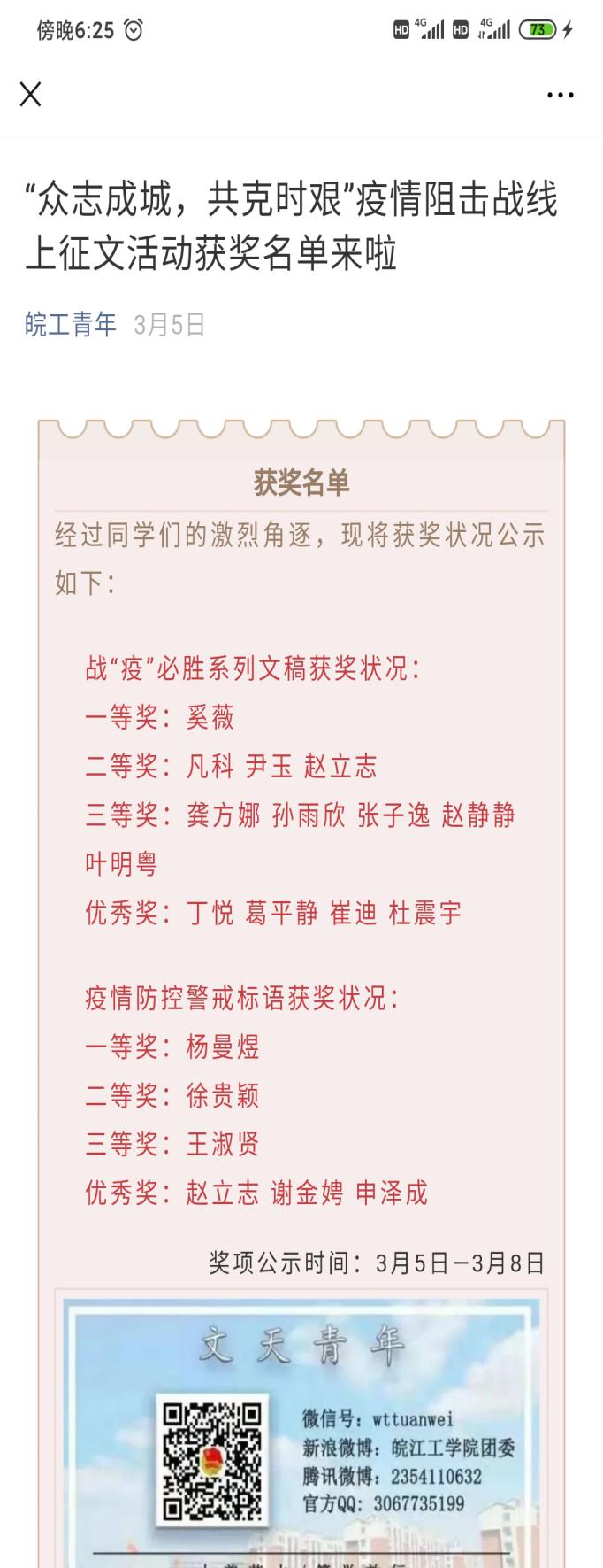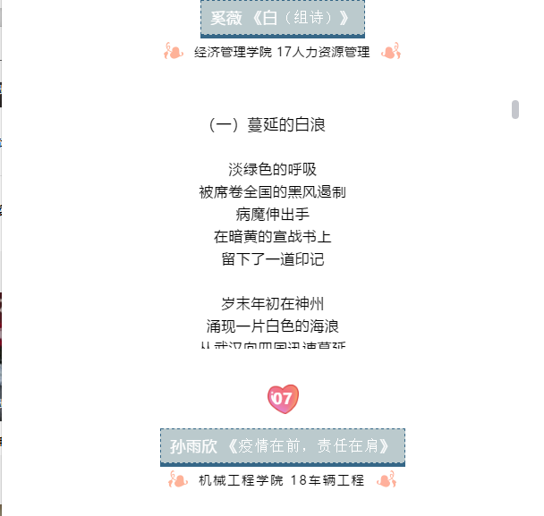 学生以笔为戎,书写疫情下青年一代的责任与担当。活动结束后,校团委共收集到百余篇作品,并筛选部分优秀作品刊登在校团委官方微信公众号“皖工青年”上进行投票。活动本着公平、公正、公开的原则,共评选出一等奖2名、二等奖4名、三等奖6名、优秀奖7名。