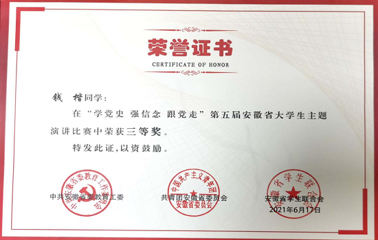 20级健康服务与管理专业的钱楷《奉献我青春,扬帆新时代》荣获市二等奖,18级能源与动力工程专业的汪始兴《青春铸就时代,韶光不负国家》荣获市优秀奖。同时,月初在合肥举办的安徽省“学党史、强信念、跟党走”大学生主题演讲比赛中,钱楷同学荣获省三等奖。