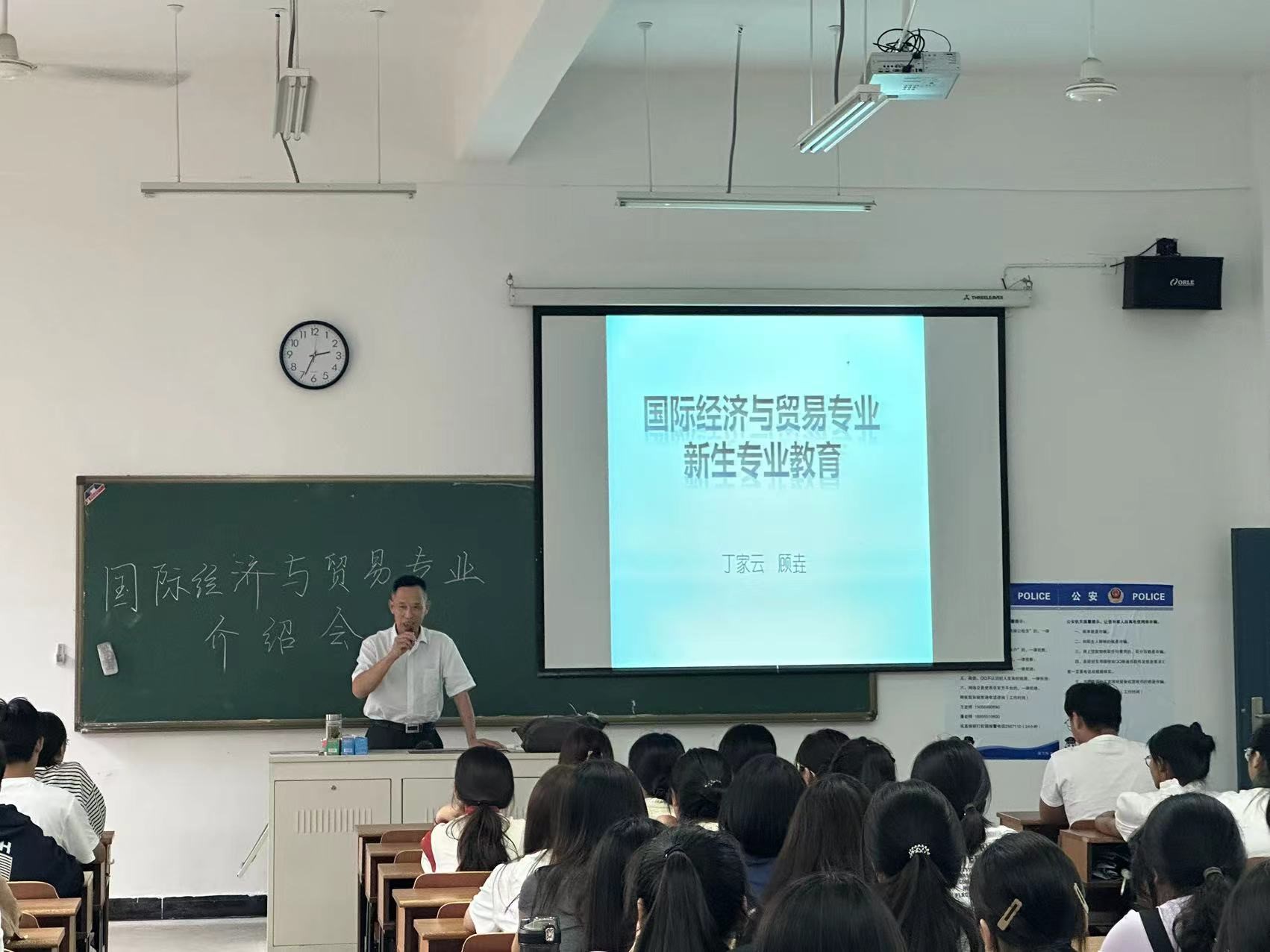 国贸专业的介绍由校督导、校党委书记、国贸专业负责人丁家云和国贸教研室主任顾垚负责,丁家云首先介绍了国际贸易专业的学科背景和发展趋势,强调了全球化时代对国际贸易专业人才的需求。顾垚则详细介绍了国际贸易专业的课程设置、实践教学和就业前景,她特别强调了理论与实践相结合的重要性,鼓励新生们积极参与实践课程,努力提升自己的专业能力。