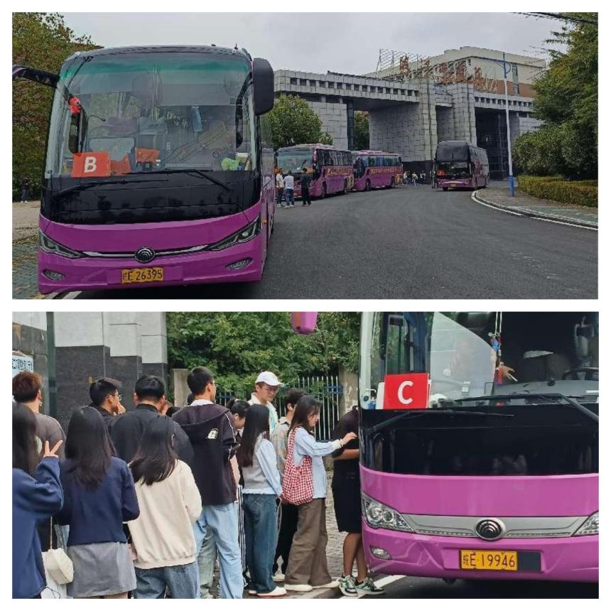 10月13号上午8点30分,大三年级学生从霍里山校区东门集合。下午1点10分,大二年级从郑蒲港校区正门集合。各班班长维持秩序安排学生上车。在到达观影地点后,学生们下车分为两队前往万达影城等待观影。