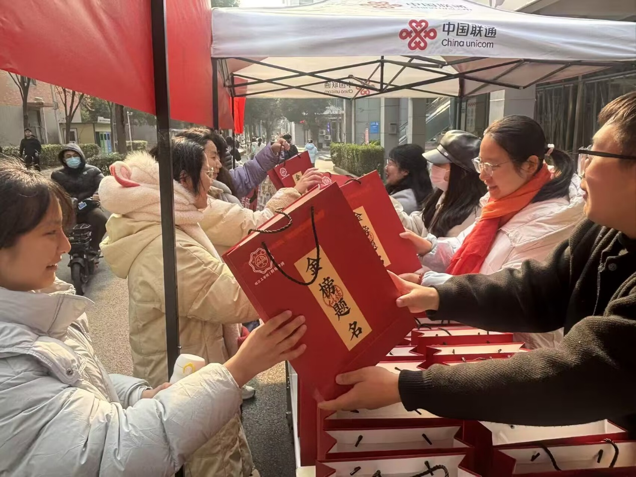 12月17日中午11点20分,霍里山校区送考活动在第二餐厅旁正式拉开帷幕。现场精心布置的祝福展板集中展示了郑蒲港校区送来的祝福卡片,成为活动亮点之一。财经学院为考研学生准备了寓意深刻的“考研助力大礼包”,每份包含:象征“一举夺魁”的向日葵针织花束、寓意“好运旺旺”的奶糖、代表“心想事成”的新鲜橙子、保障考试顺利的2B铅笔套盒以及满载祝福的励志贺卡。
