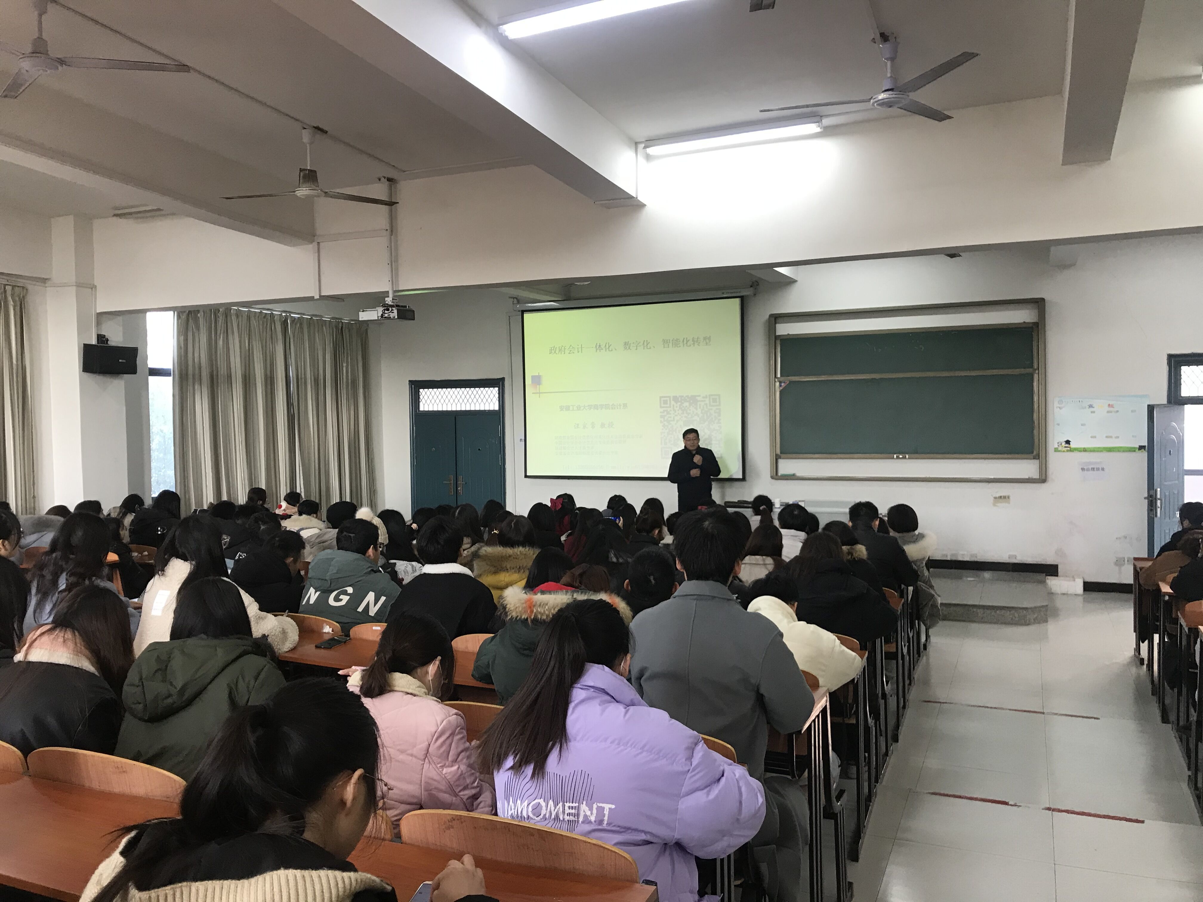 2020年12月16日上午9时,财政部全国会计信息化标准化技术委员会咨询专家、财政部会计人才库专家、中国会计学会会计会计信息化专业委员会咨询专家、安徽省会计准则制度咨询专家、安徽工业大学会计学教授汪家常应邀,在beat365官网S楼307教室为我院师生做关于“政府会计的一体化、信息化、智能化转型”的学术讲座。本次讲座由财经学院院长徐德信主持。