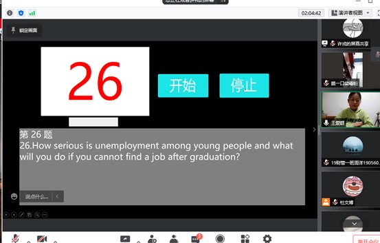 面试最后,许戎老师作总结。在当前这样的时间节点上举办线上面试,就是希望同学们调整应试状态,吸取此次面试的经验,优化口语听说能力,回顾和梳理专业知识,也祝愿财经学子在不久之后的考研复试中取得优异的成绩。