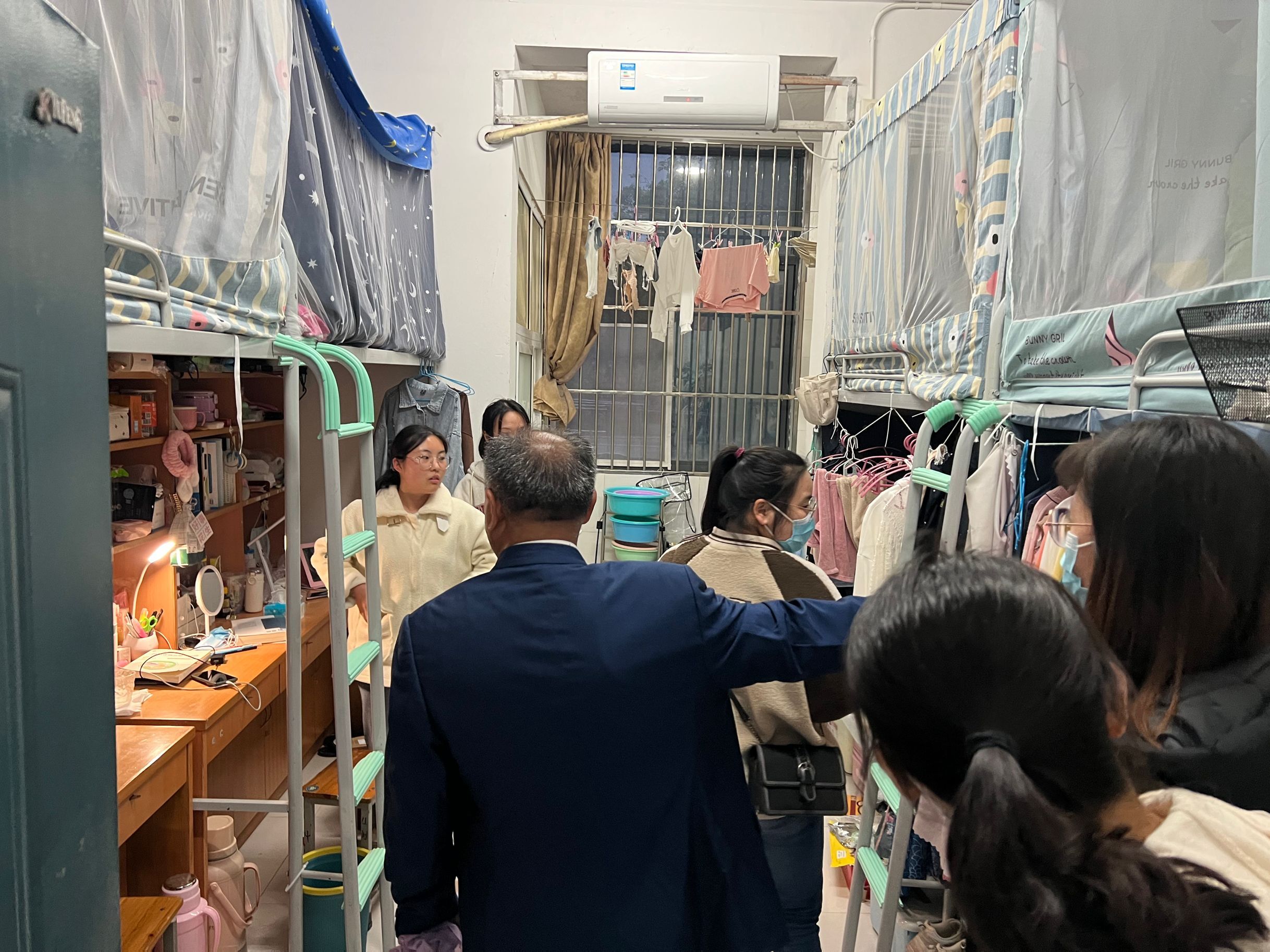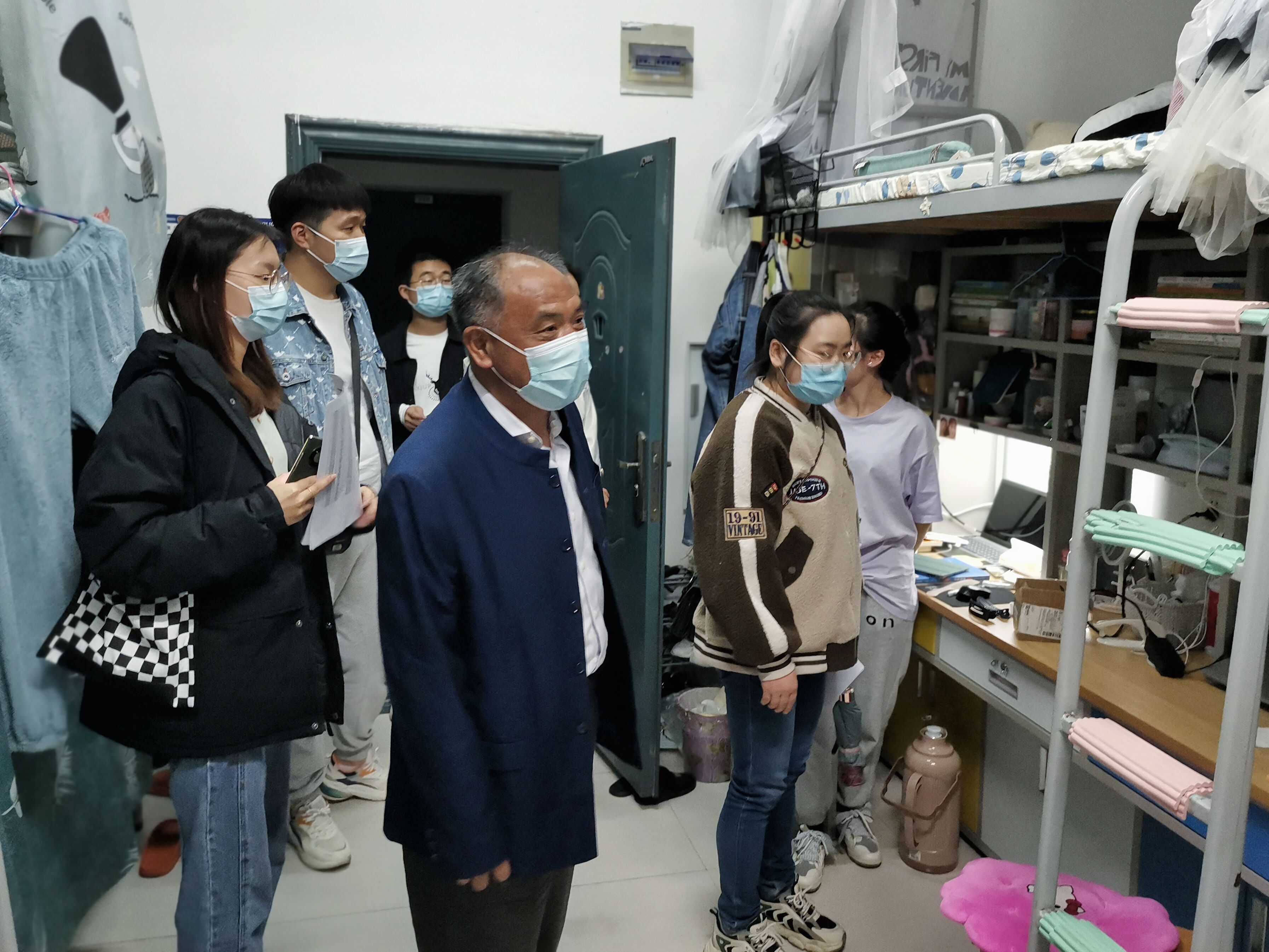 徐院长与学生亲切交流,对学生的思想状况、学习情况、宿舍安全等方面进行了深入细致的交流。他提醒同学们防疫措施不放松,注意个人生活卫生,保持寝室环境清洁,勤洗手、勤通风,定期晾晒被褥,出宿舍时一定要戴好口罩,非必要不请假,严格遵守学校的规章制度,确保疫情时期个人防护不放松。