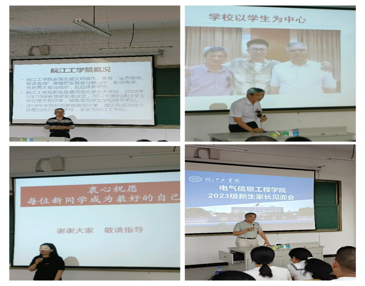 乔晓华院长介绍学院概况、校训校风、师资队伍、考研就业、人才培养方向,并向新生家长介绍大学四年总体培养规划,让新生家长知道了孩子四年的学习生活,为家长们助力学生培养指明了方向;朱昌平教授从学校的办学理念“一切为了学生、为了学生一切、为了一切学生”出发,汇报了引导大学生应该在大学时光里要选择正确的道路,并生动的归纳出“跑对地方”、“交对朋友”等建议,努力让每位同学都能成为最好的自己;马羽佳副书记介绍了校纪校规及新生们在学校的规范学习、有序生活等内容并代表辅导员表态:认真履职做学生的示范和引路人。家长现场提问,领导和老师为他们解答,及时解决学生家长中的疑问。 最后,杨安胜书记讲话,他讲在这美丽的校园,你们的孩子揽万卷文采,汲百代精华,迈出人生更为重彩的步伐。他从立德立志是育人之根本、立学立勤是育人之要求、立新立行是育人之法宝三方面阐述了学生如何学,家长如何做,学院如何培养,共同发力培养新人,共同努力让新生们在电信院这片肥沃的土壤中,扎实生根、茁壮成长、开出理想之花。