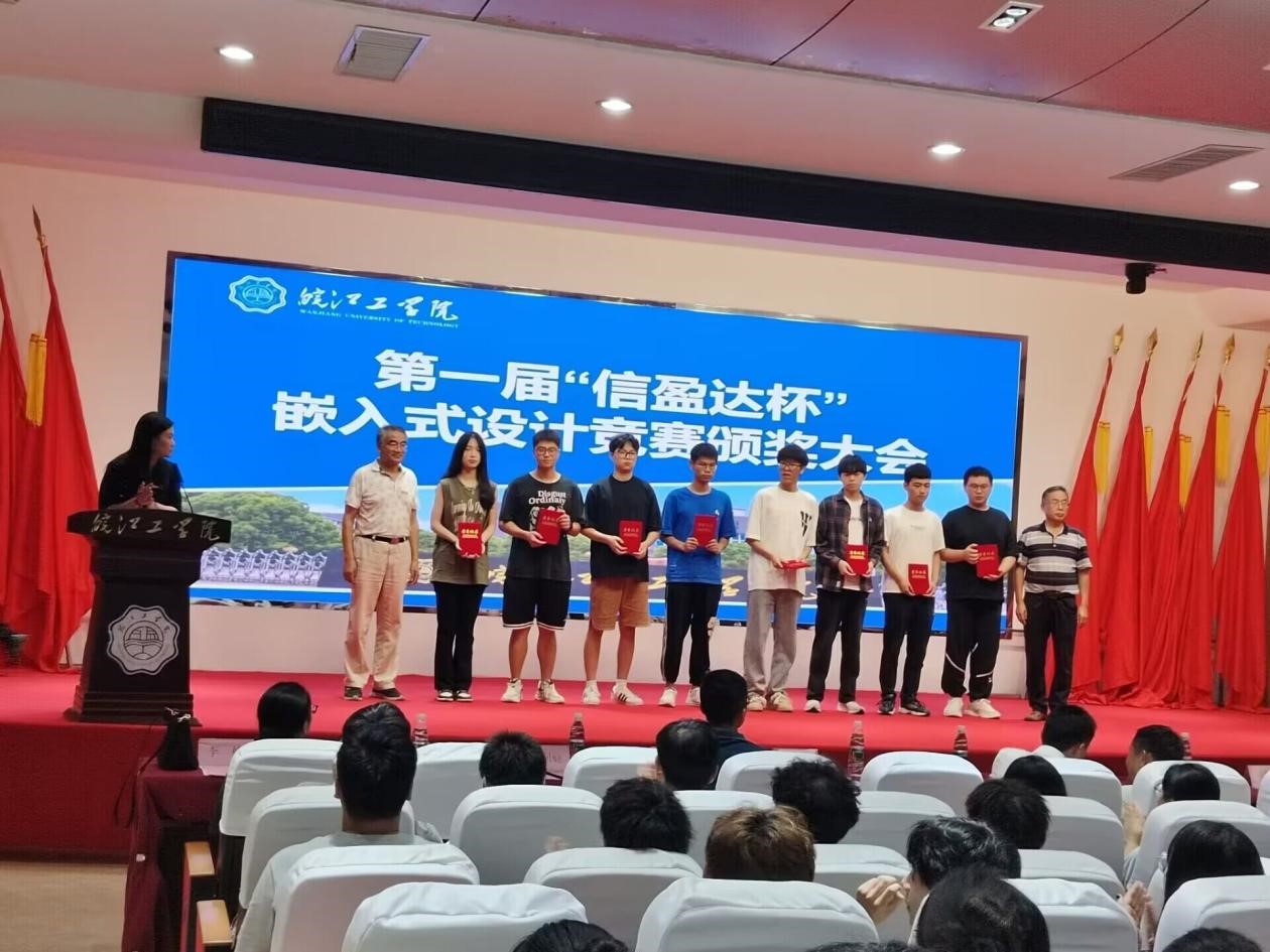 第一届"信盈达杯"嵌入式系统创新设计竞赛:李伦翠、周宇昕两个团队荣获一等奖,苗瑞、戈帅、邱赛男三个团队荣获二等奖,秦毅恒、张郭超、王旭、俞克勤四个团队荣获三等奖,若干团队荣获优秀奖。领导嘉宾进行颁奖并合影留念。