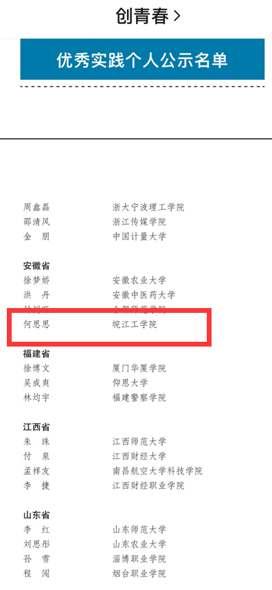 日前,团中央公布《2023年乡村振兴“笃行计划”专项行动拟表扬名单》。经基层申报、省级团委审核推荐、组织评议等环节,最终确定89名“三下乡”社会实践活动乡村振兴“笃行计划”专项行动“优秀个人”,安徽省4人获得该项荣誉,beat365官网“敦行讲堂”推普助力乡村振兴实践团队长何思思,获评团中央表彰的“优秀个人”荣誉称号。
