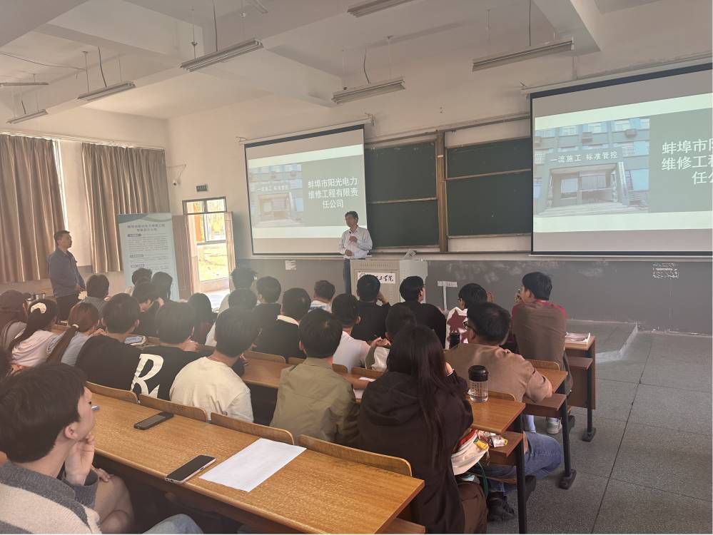 会上,人事部主任石盼盼全面介绍了公司本年度招聘的岗位,陈波总经理详细介绍了蚌埠市阳光电力维修工程有限责任公司的发展历程、企业优势、主营业务及岗位需求。他表示,公司自2004年成立以来,一直专注于电气设备安装、维护电网系统等业务,并凭借专业的技术团队和优质的服务,赢得了市场的广泛认可。结合去年入职的毕业生陈晓宇近一年来工作优秀的表现,对电信工程学院的人才培养质量给予了高度评价,电气工程及其自动化专业人才培养与电力公司的人才需求高度契合。