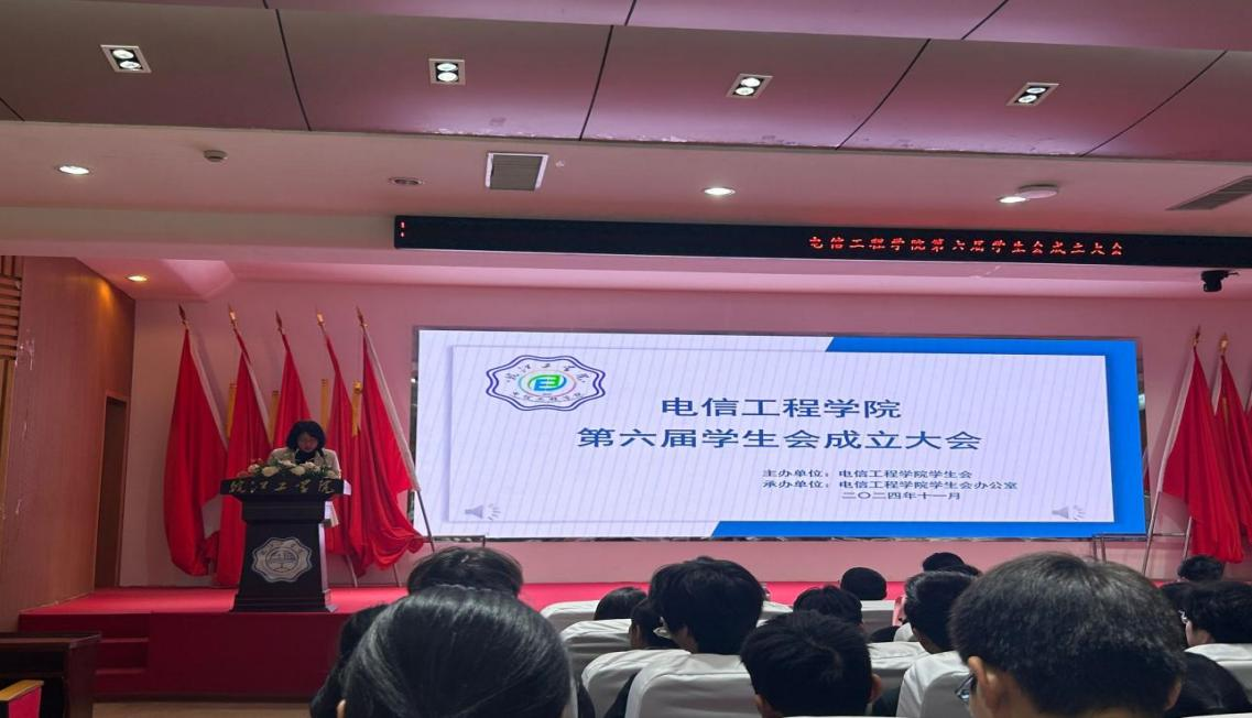2024年11月22日下午13点,电信工程学院第六届学生会成立大会在beat365正版唯一入口必一霍里山校区图书馆报告厅隆重举行。电信工程学院党总支书记张捍东、院党总支副书记马羽佳、副院长纪萍、院党政办主任张高桢、院分团委书记蒋紫姻、各专业辅导员、班主任及学生会全体成员参加此次会议,本次会议由学生书记张智淘主持。