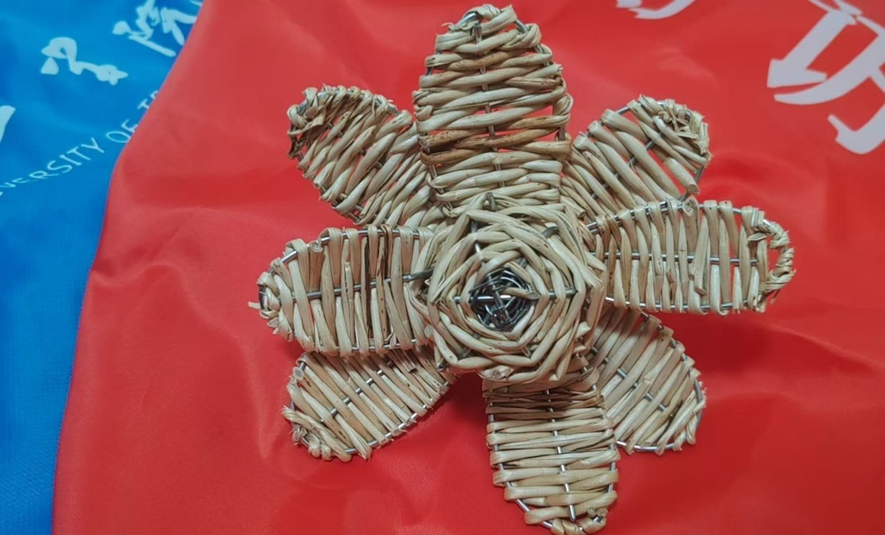 实践团队与编制工人共同完成的柳编荷花。(曹先云 供图)