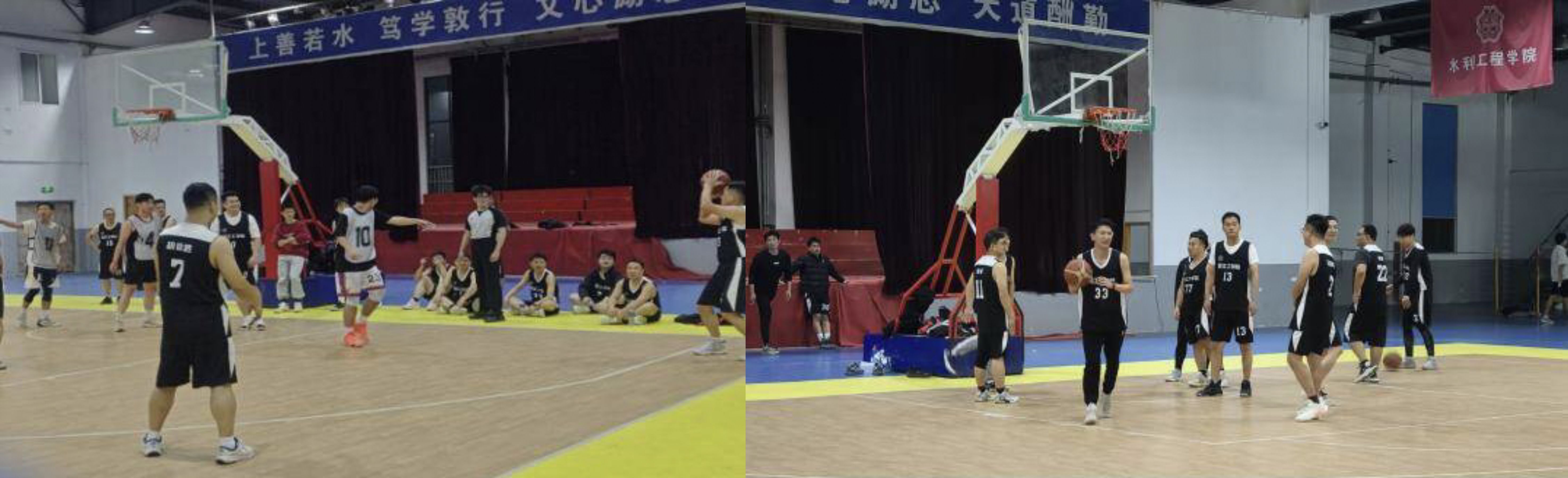 赛前氛围早已被精心烘托:电信工程学院学生会自制的“师生同心,赛场同行”红色横幅醒目悬挂,字字传递着对赛事的期待与师生同心的信念。教师球员与学生对手提前在场边互动,或是探讨战术细节,或是调侃彼此球技,轻松的谈笑间,师生间的距离悄然拉近。随着裁判一声清脆哨响,比赛正式开场——教师队身着黑色球衣,凭借老道的赛场经验与默契配合,以沉稳传球、严密防守掌控节奏;学生队则以白色球衣为标识,带着青春的冲劲与敏捷身手,在赛场上来回奔袭,快速突破、积极抢断,用蓬勃活力直面“挑战”,攻防之间,尽显师生运动风采。