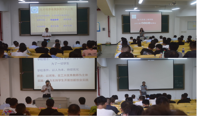 电气信息工程学院院长乔晓华,党总书记杨安胜,双创学院院长朱昌平,党总支副书记马羽佳,院长助理倪天伟、胡徐胜,党政办主任张高桢,学工办副主任孙伟,教学办副主任高红,辅导员刘华辉、史思岩、周颖,以及21届新生及家长参加了此次会议。