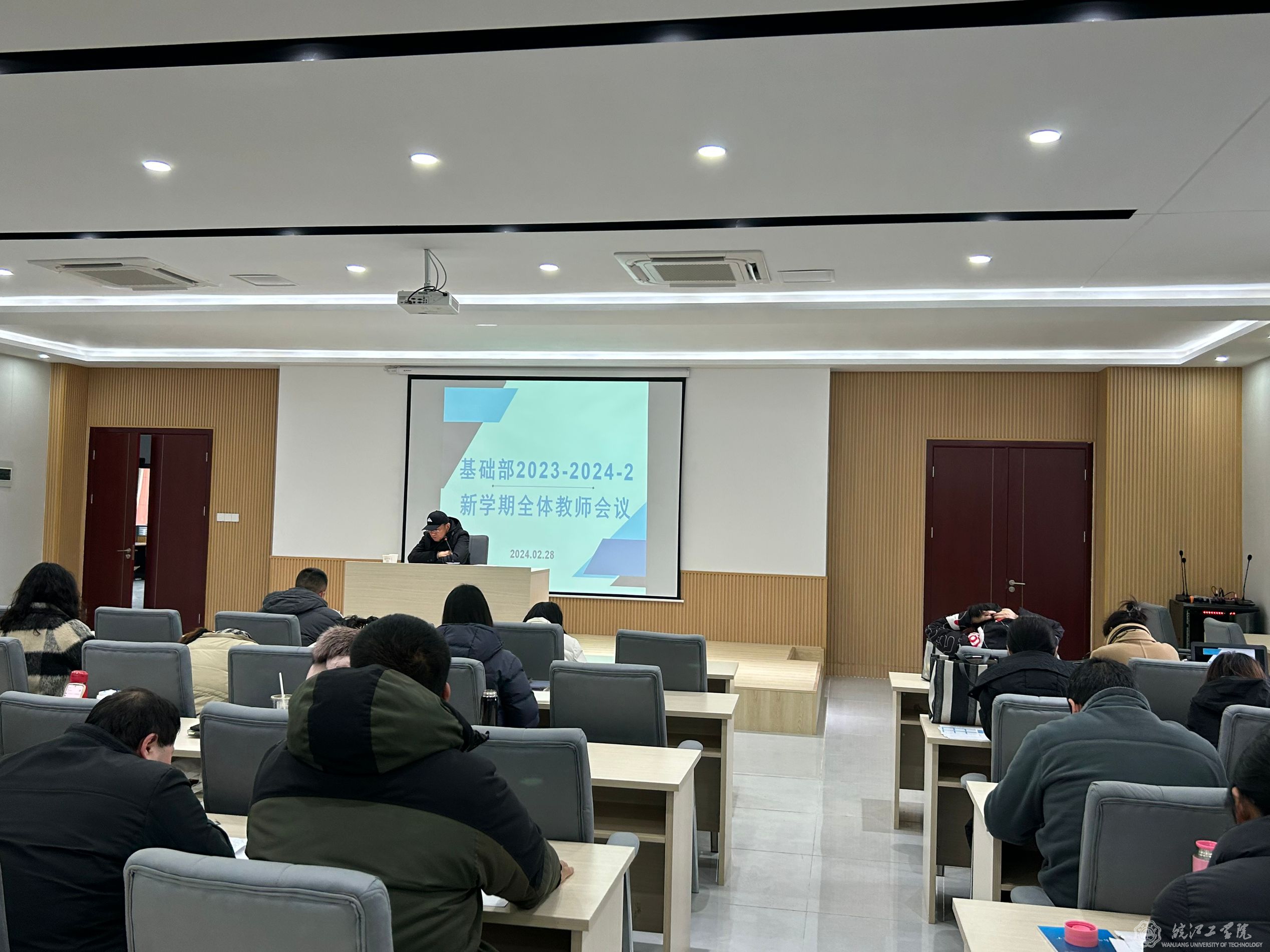 2024年2月28日下午,基础部在新财经管理楼209教室召开了开学季全体教师会议。党总支书记侯进元、部主任余明江、主任助理毕胜琴和全体教职工参加,会议由余明江主任主持。本次会议就党建与思想政治建设、学校与基础部重点工作落实、新学期教学与科研工作要求做了安排。