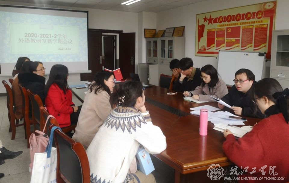 3月10日下午,基础部外语教研室在E218召开教研室新学期工作会议,布置新学期的各项工作,教研室主任彭饮冰、副主任庆凌和教研室全体专职教师参加会议,会议由庆凌主持。