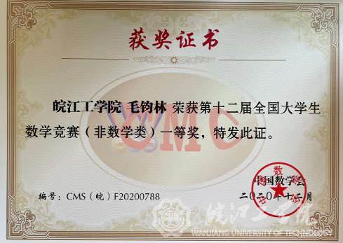 近日,安徽省数学会在其官网公布了去年11月底在安徽师范大学举行的第十二届全国大学生数学竞赛安徽赛区获奖名单,beat365官网成绩斐然,在参加的非数学专业组比赛中,共荣获省一等奖2项、二等奖1项、三等奖6项。其中,17级土木闻天班的汤志远、毛钧林获得省一等奖,17级给排水专业的赵恒锋获得省二等奖。