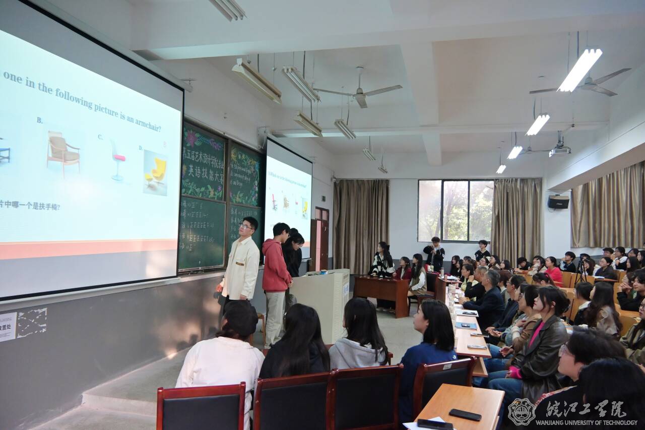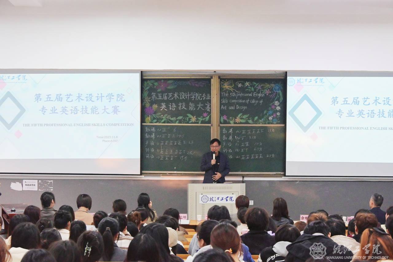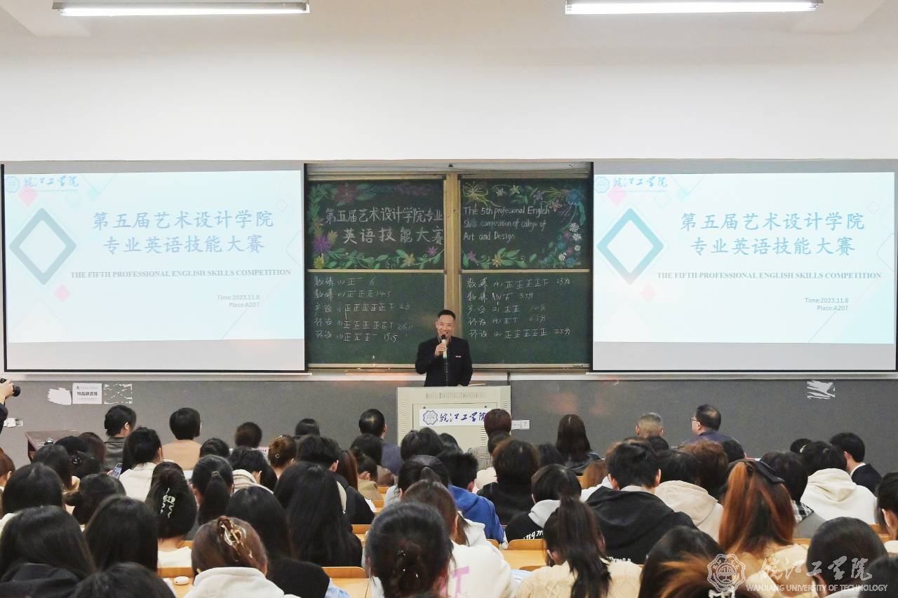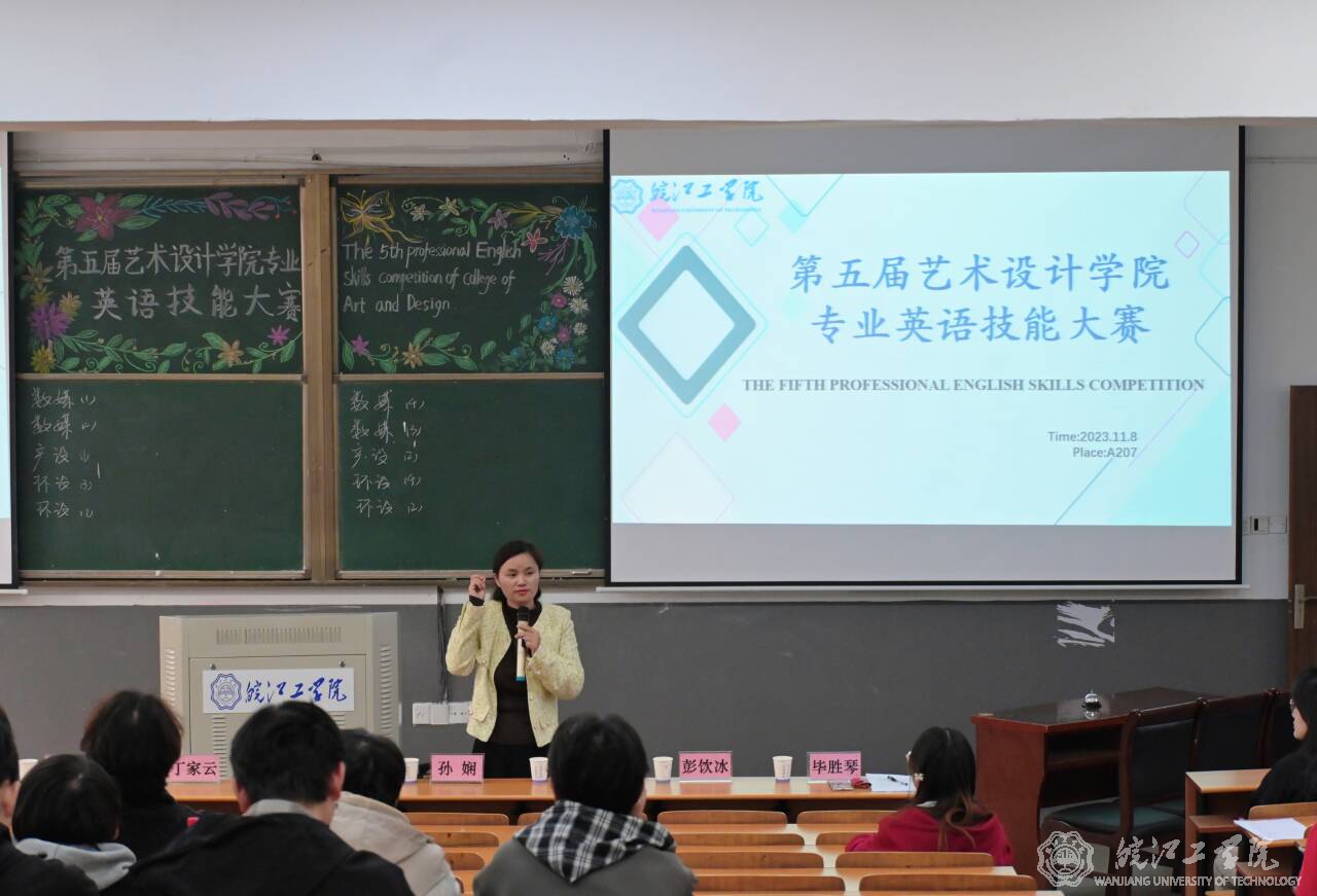 11月8日下午,校第五届艺术设计学院专业英语技能大赛在A207成功举行。本次大赛由基础部外语教研室毕胜琴老师组织策划,艺术设计学院学生全体参与。校党委书记丁家云,艺术设计学院党总支书记张亚梅、院长伍旭坤,基础部主任余明江,教务部常务副部长孙娴,评估办常务副主任黄翠,艺术设计学院副院长金花,党总支副书记程楠楠,分团委书记刘慧等出席观摩,比赛在毕胜琴老师的致辞中拉开帷幕。
