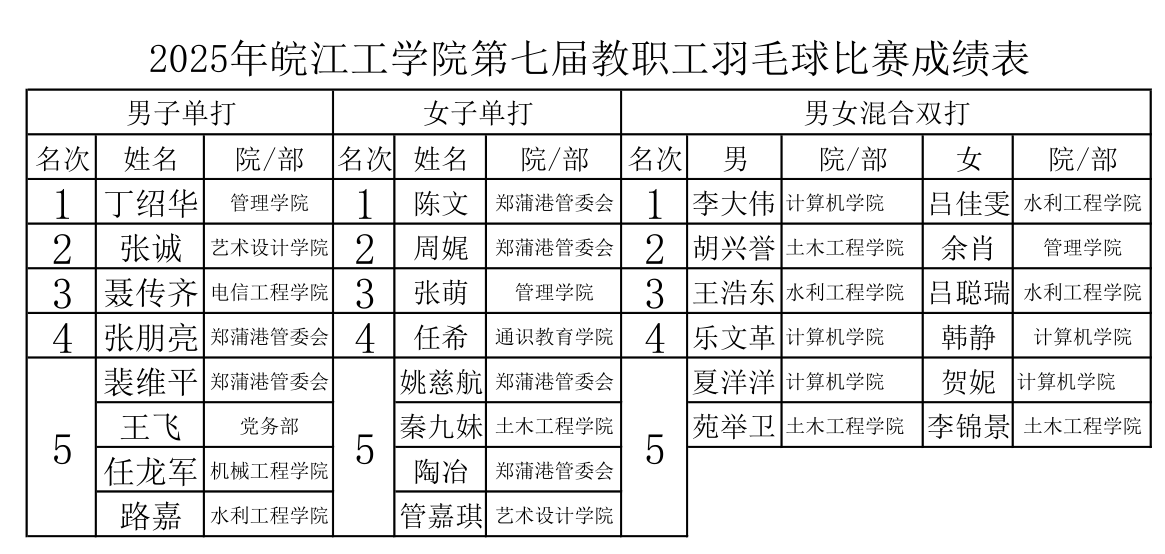 本次羽毛球赛的成功举办,不仅为教职工提供了锻炼身体、切磋球技的平台,更促进了各部门之间的交流与合作,进一步增强了学校的凝聚力和向心力。未来,校工会将继续组织丰富多彩的文体活动,推动校园体育文化建设,助力教职工以更饱满的热情投身教育事业。(通识教育学院 供稿)
