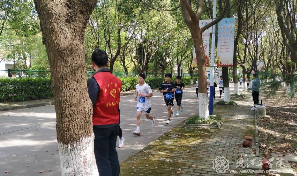 基础部体育教研室老师精心筹划了比赛的路线和细节安排,运动员们首先绕着操场跑完一圈,然后拐出操场,经过篮球场、学校东大门、环形大道、学生宿舍回到田径场,按照此路线环绕校园三圈,总共六公里。沿途安排志愿者给运动员指明路线、维护比赛秩序、茶水供应,校医务室医务人员也在现场候命应对突发状况。100余名师生报名参加了本次比赛。正式开赛之前,体育教研室主任孔祥龙提醒运动员做好赛前热身,希望每位运动员赛出风格、赛出水平。随着李云伟老师一声枪响,在观众的呐喊助威声中,参赛运动员沿着规定路线行进。沿途绿树成荫、鲜花绽放,让人感觉仿佛置身于美丽的大自然中比赛。