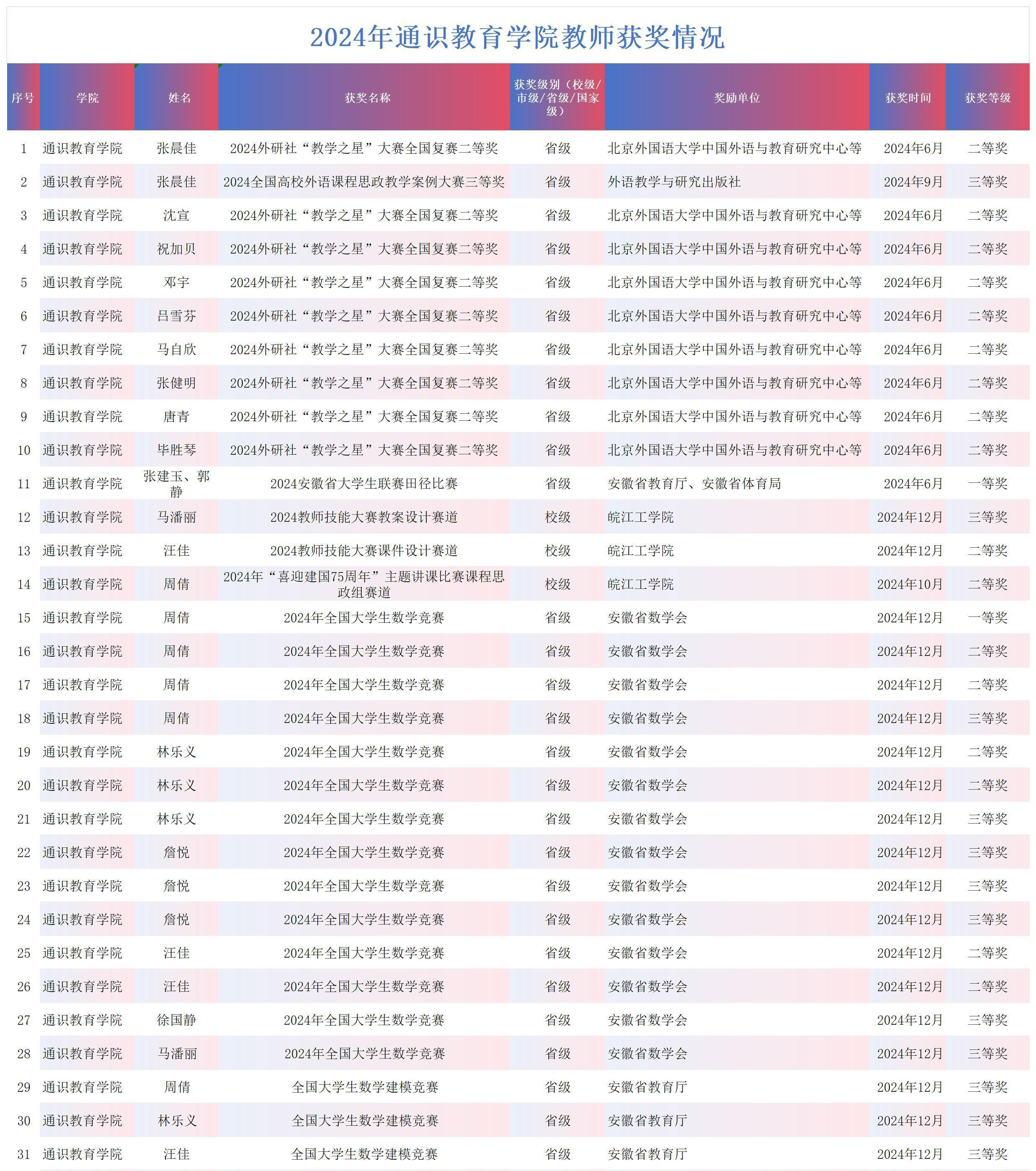 通识教育学院领导创新管理,充分发挥教研室的作用,为教师发展创造各种有利条件,近年来,通识教育学院教师共成功立项各类省级课题30余项,荣获各类省级荣誉称号10余项,其中1位教师光荣当选省党代会代表,1位教师被评为安徽省“最美军嫂”,数位教师先后被评为“安徽省模范教师”、“安徽省优秀教师”、“安徽省教坛新秀”。通识教育学院教师指导学生参加各类学科竞赛,累计获得各种奖励共200余项,其中国家级奖项10余项, 省级奖项251项(不含省级优秀奖)。