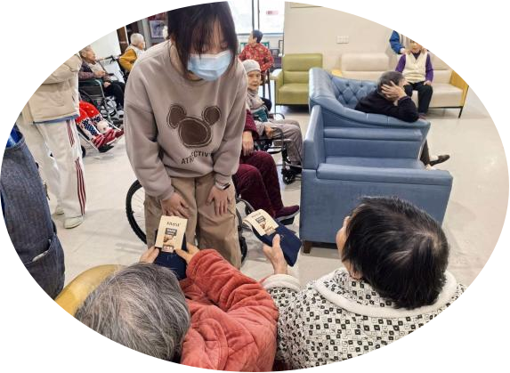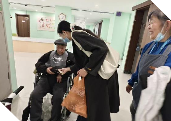 老人们午休醒来后,志愿者们分为两组,在工作人员引导下进入起居区。此次慰问的重点是一群存在认知障碍的老人。同学们轻轻围坐老人身旁,手拉手唠家常、问冷暖,细致叮嘱保暖与饮食卫生。暖心举动换来连连称赞,一位退伍老兵听到志愿者哼唱的红歌时热泪盈眶:“这首曲子,让我想起和父辈一起参军的日子!”朴实的话语里浸透着岁月的厚重与当下的感动。