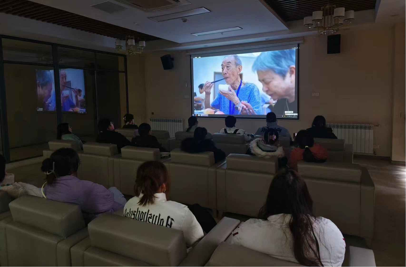 同学们首先观看了宣传片,对江东颐养的服务理念、运营模式以及发展历程有了初步了解。
