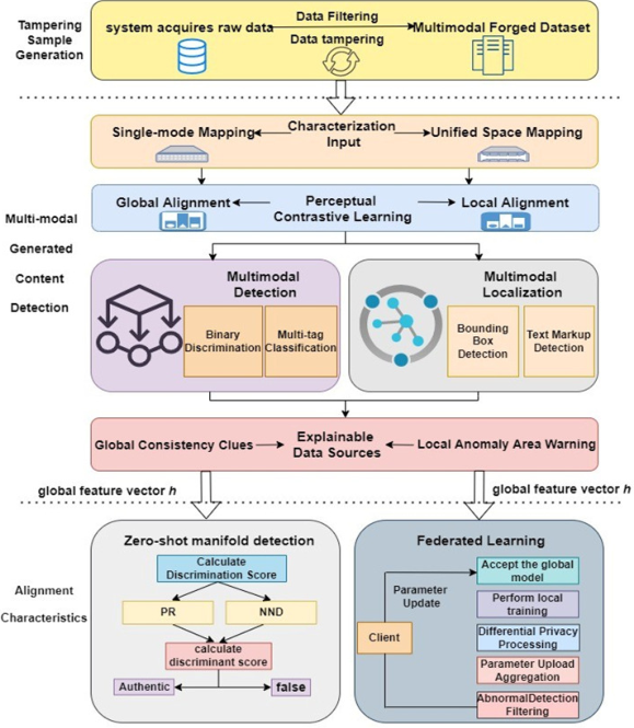 随着多模态生成式人工智能(GenAI)技术的快速发展,自动合成内容显著提升了信息传播效率,但也带来了严峻的内容安全与深度伪造的挑战。针对当前多模态检测在跨模态语义不一致性、泛化能力不足以及大规模数据隐私泄露方面的核心瓶颈,研究团队提出了一种用于多模态生成内容检测的隐私保护系统框架。该研究构建了基于层次化推理的STRIKE核心机制以实现跨模态语义精准对齐;提出了零样本流形检测算法以突破过度依赖特定伪影的检测范式,提升未知生成模型的泛化能力;融合联邦学习架构实现了多源数据隐私保护与协同优化。实验评估表明,该方案在严格的隐私保护约束下取得了卓越的检测性能,为安全可靠的AI生成内容治理提供了新范式。