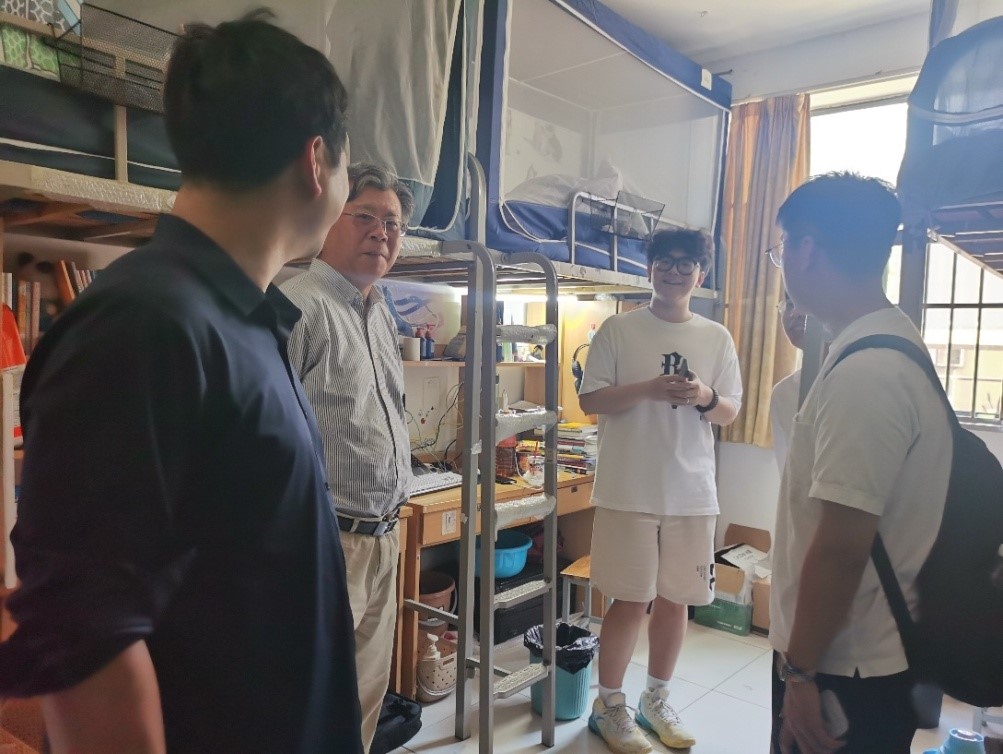 宿舍生活也是校园生活的主阵地,良好的宿舍环境对于构建良好的学习氛围、培养学生健康的身心、提高学生人际交往能力大有裨益。在学生宿舍,胡院长、王书记仔细了解了床铺分配情况、低楼层学生宿舍地面返潮情况,检查了水电设施,查看了卫生状况,询问了学生的需求。韦书记走访了女生宿舍,查看了宿舍设施,提醒学生在宿舍内注意用水用电安全,并对她们的寝室卫生状况提出了表扬。
